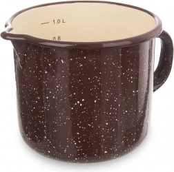 Cană emailată maro, stil retro, cu stropi bej, care ușurează gătitul și coptul de zi cu zi. Datorită ciocului practic, turnarea este comodă, iar măsura interioară permite dozarea precisă a lichidelor și ingredientelor solide fără alte ustensile. Urechea solidă asigură o manipulare sigură și confortabilă.