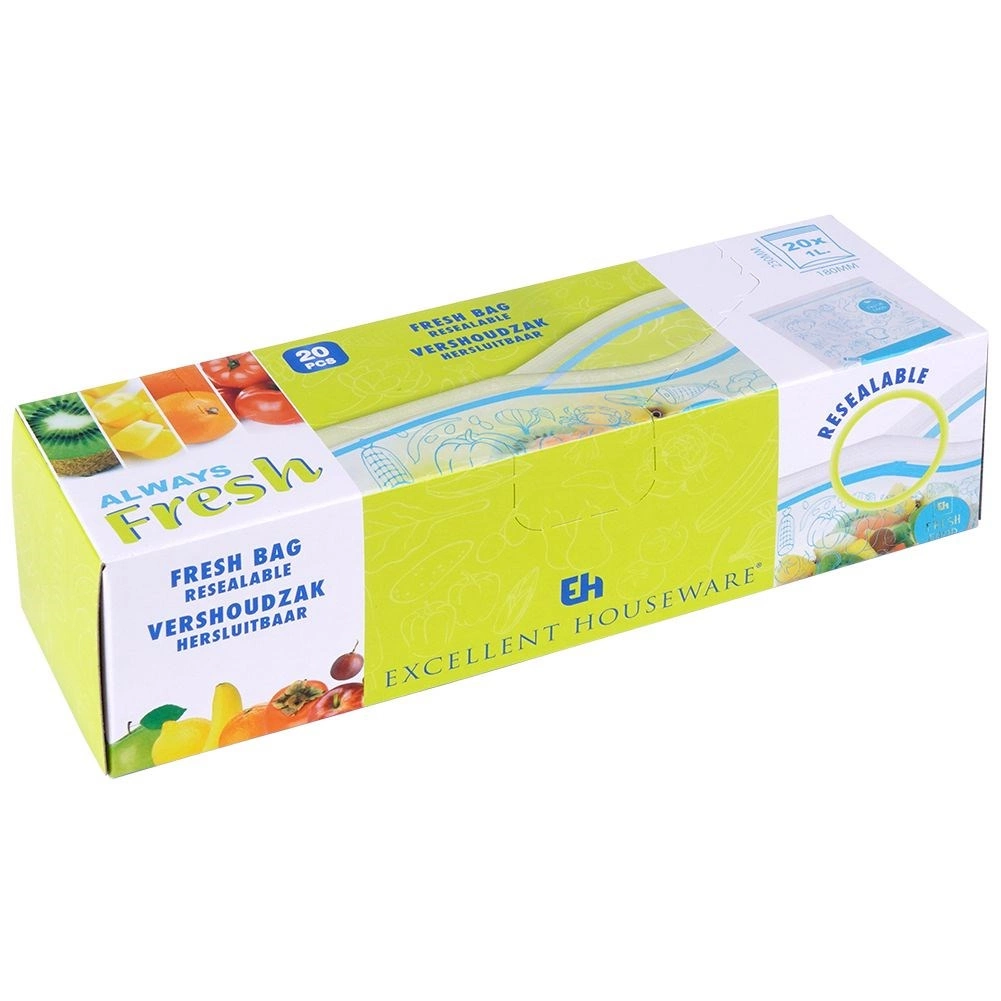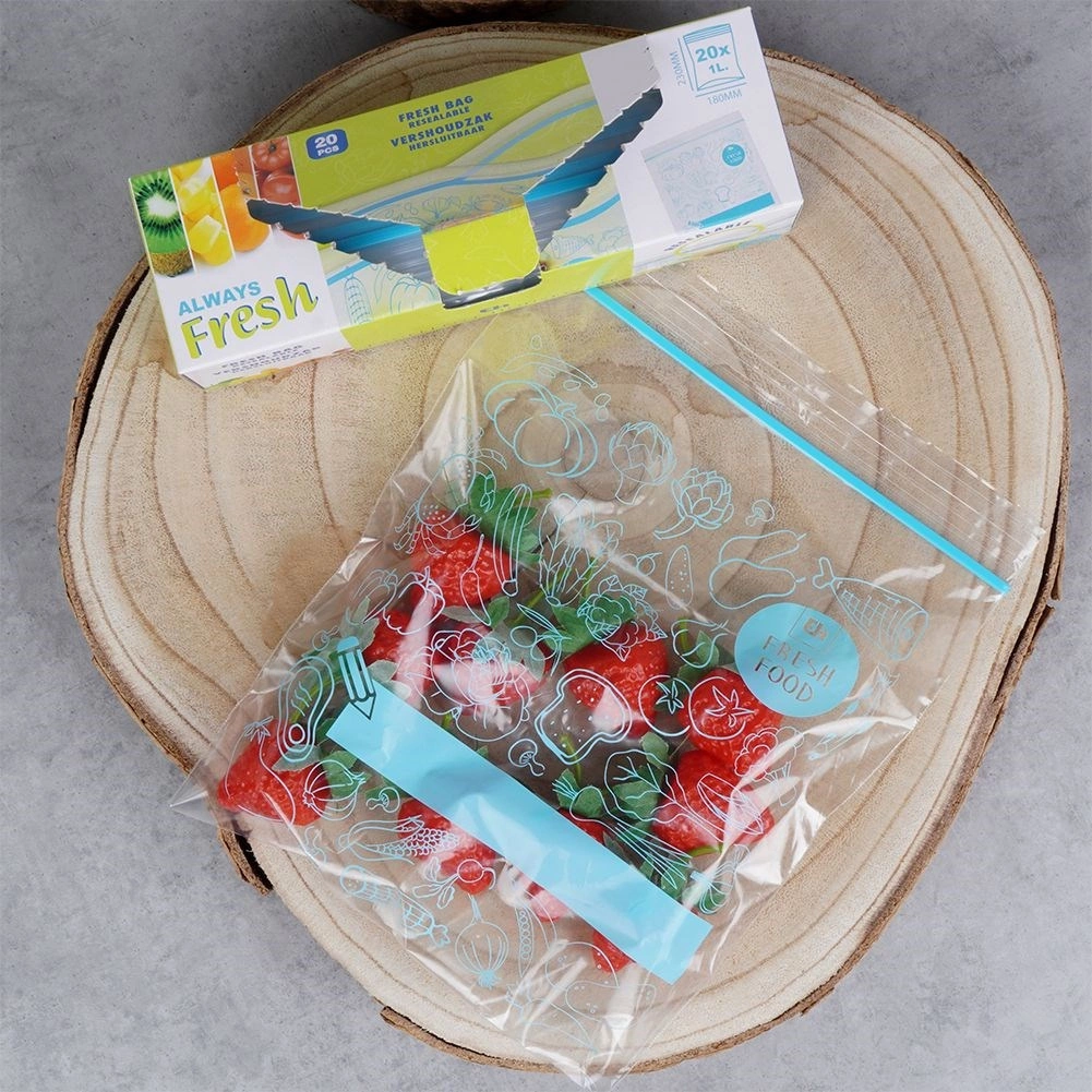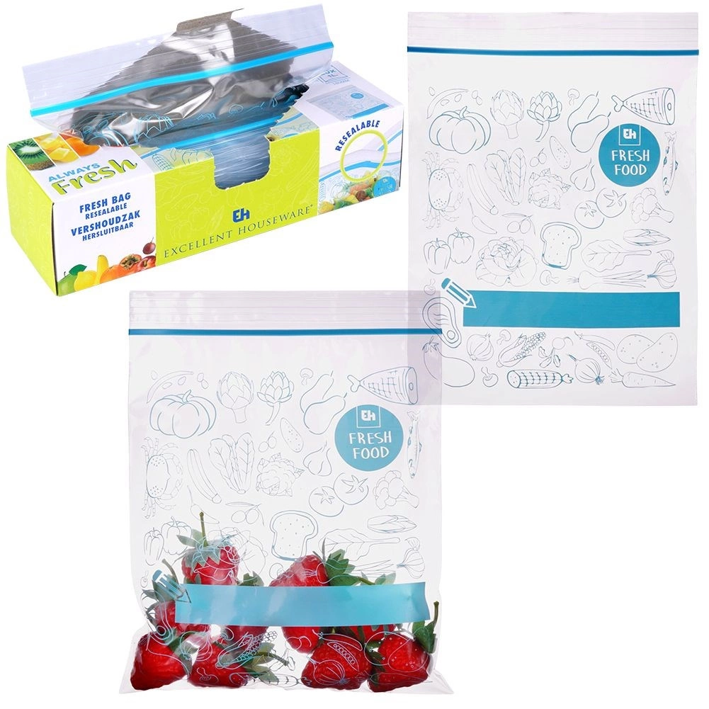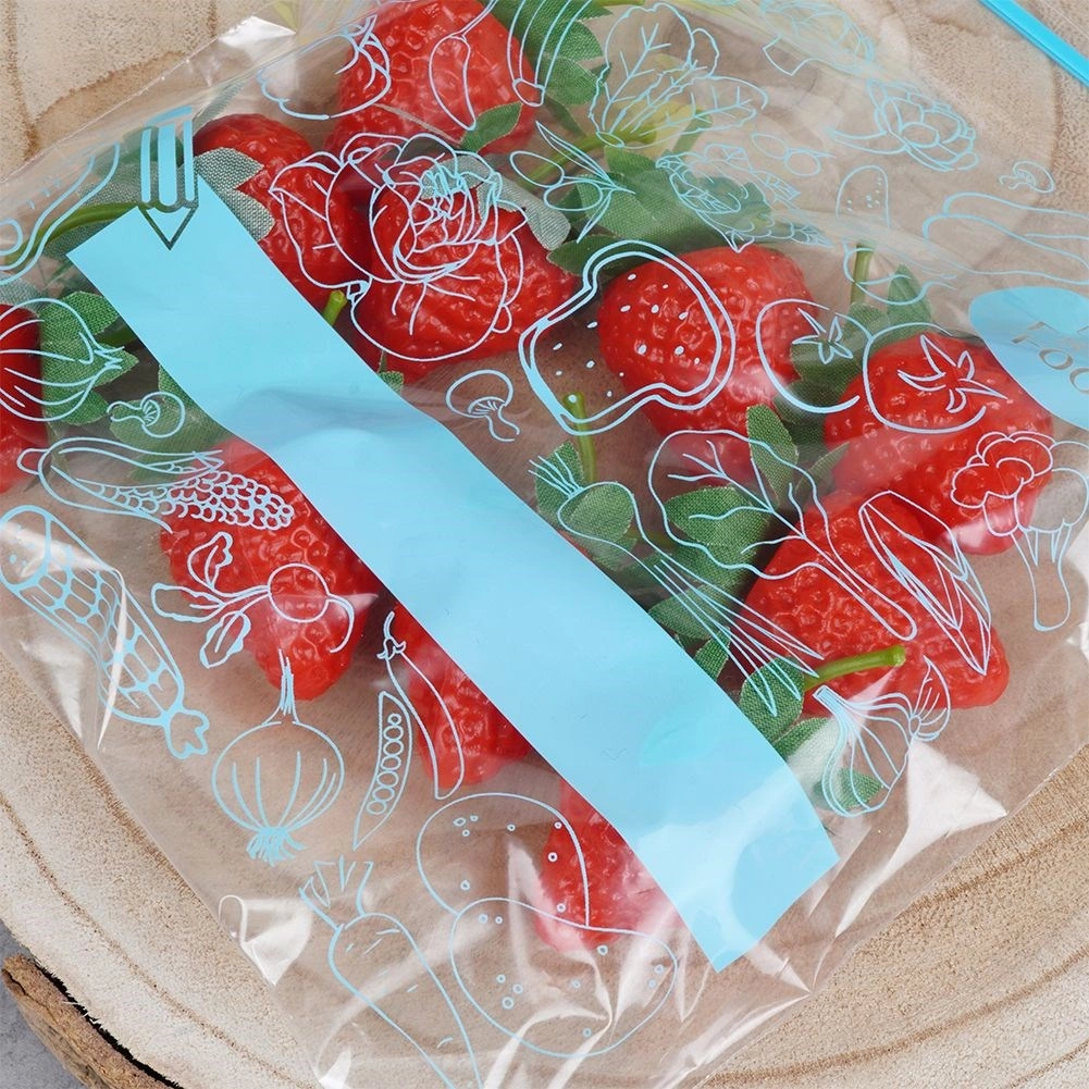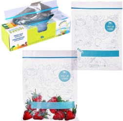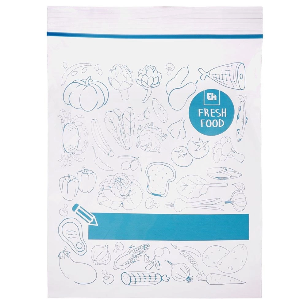 Pungile universale cu fermoar pentru alimente sunt excelente pentru depozitarea fructelor, legumelor, cărnii, produselor de panificație și a ingredientelor vrac. Datorită închiderii rezistente, conținutul nu se varsă și nu absoarbe mirosuri străine. Corpul transparent cu imprimeu albastru stilat și spațiu pentru etichetă facilitează o organizare clară în bucătărie.