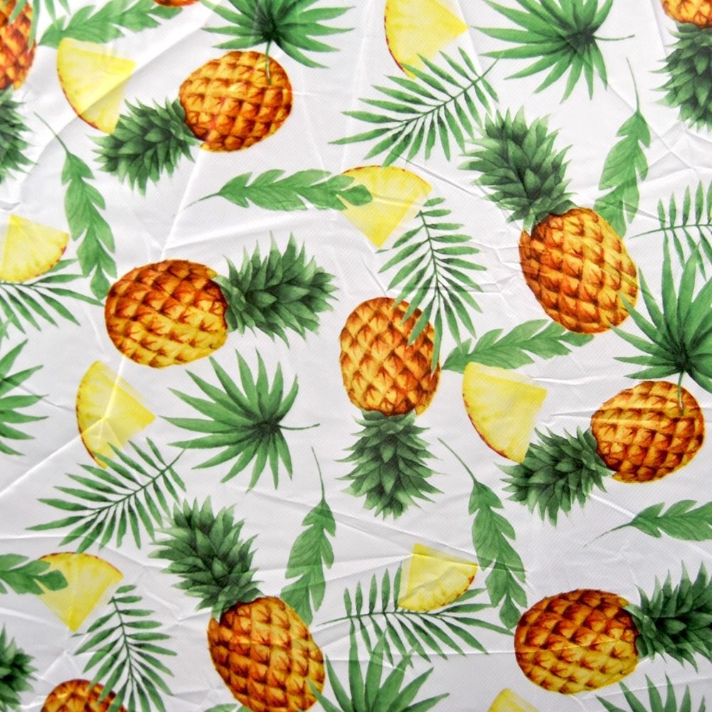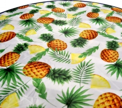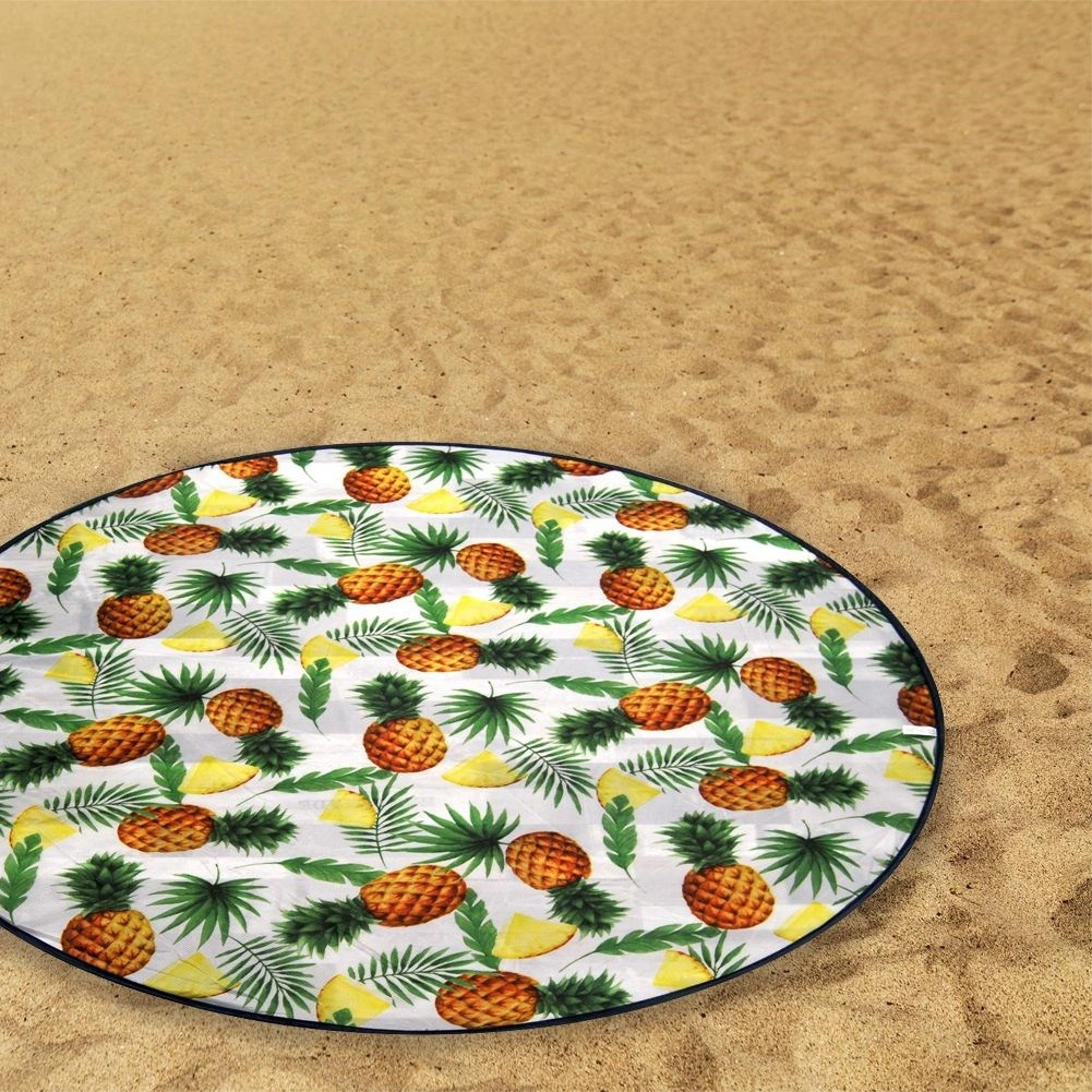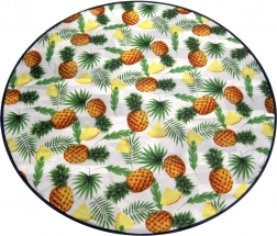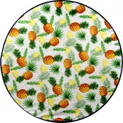 Forma rotundă și motivul cu ananași și frunze de palmier aduc o atmosferă estivală proaspătă zilelor la apă sau în parc.