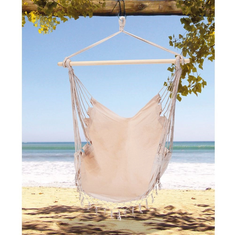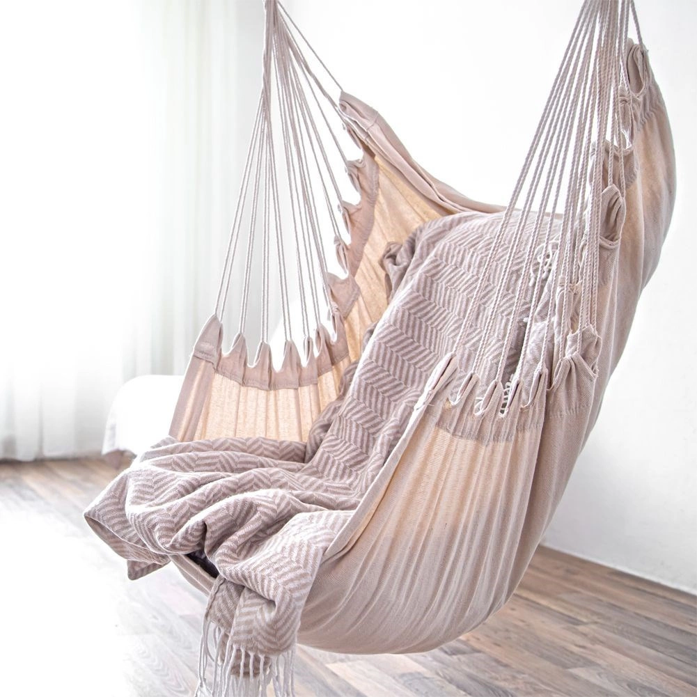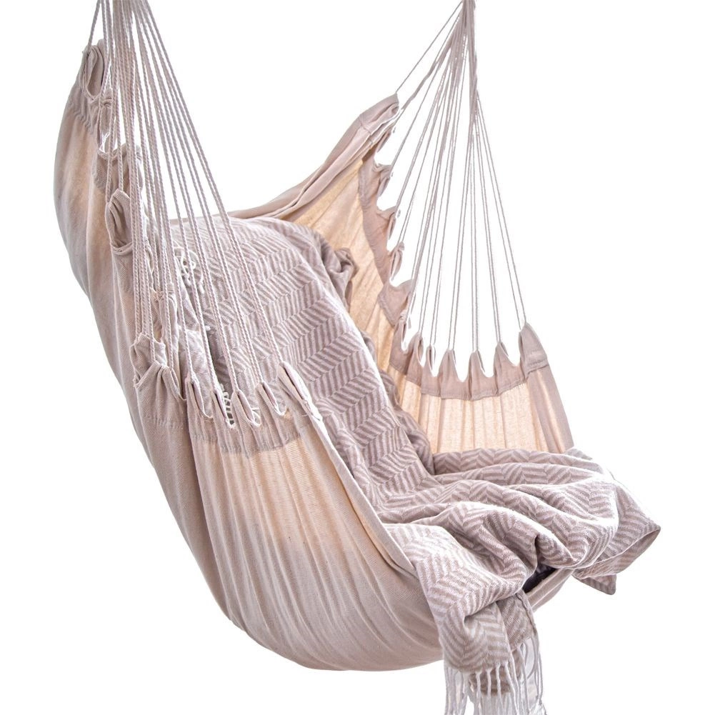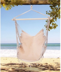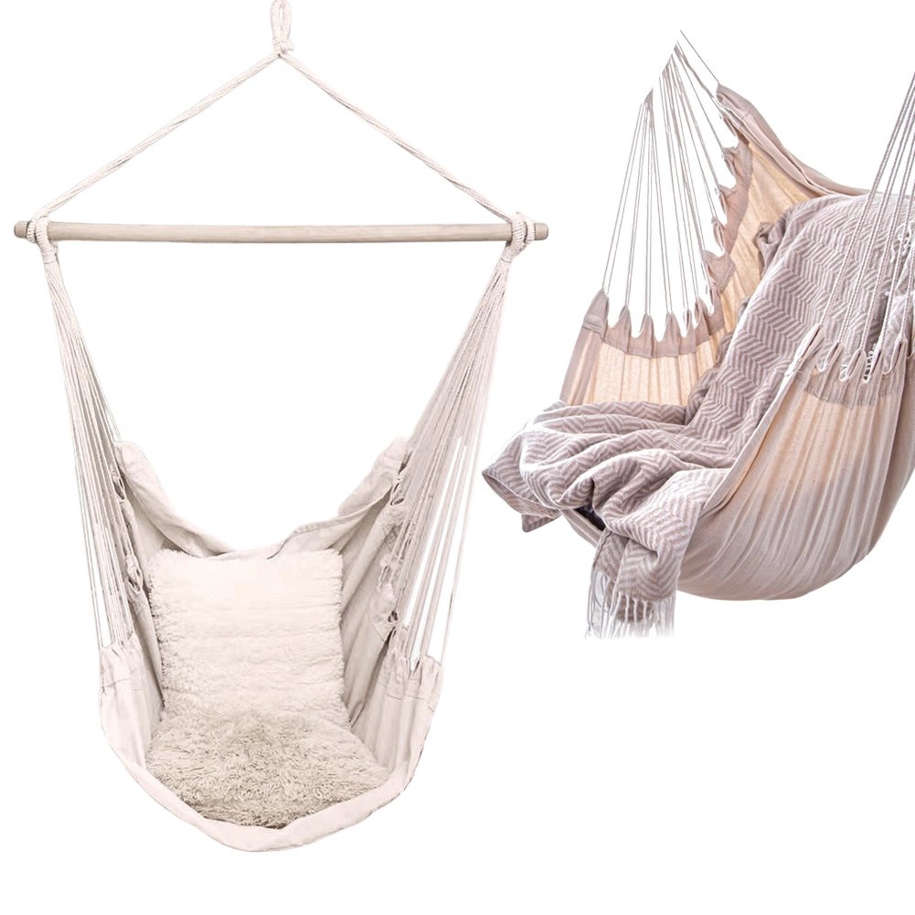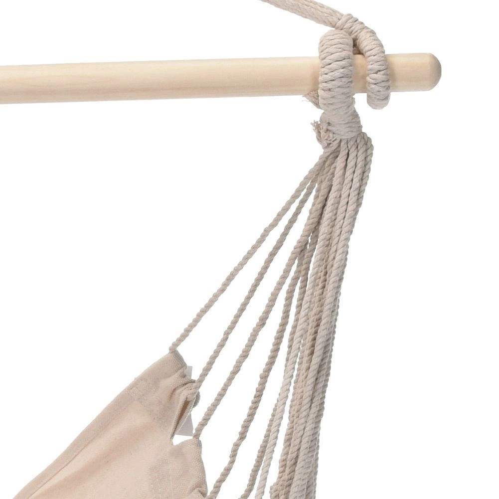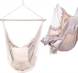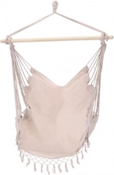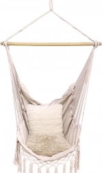 Elegantul scaun hamac suspendat, în culoare bej, este o alegere excelentă pentru grădină, balcon, terasă și interior. Datorită punctului unic de prindere, economisește spațiu și creează un colțișor primitor pentru citit și răsfăț. Construcția solidă cu bară stabilizatoare din lemn asigură o ședere confortabilă și o legănare sigură.