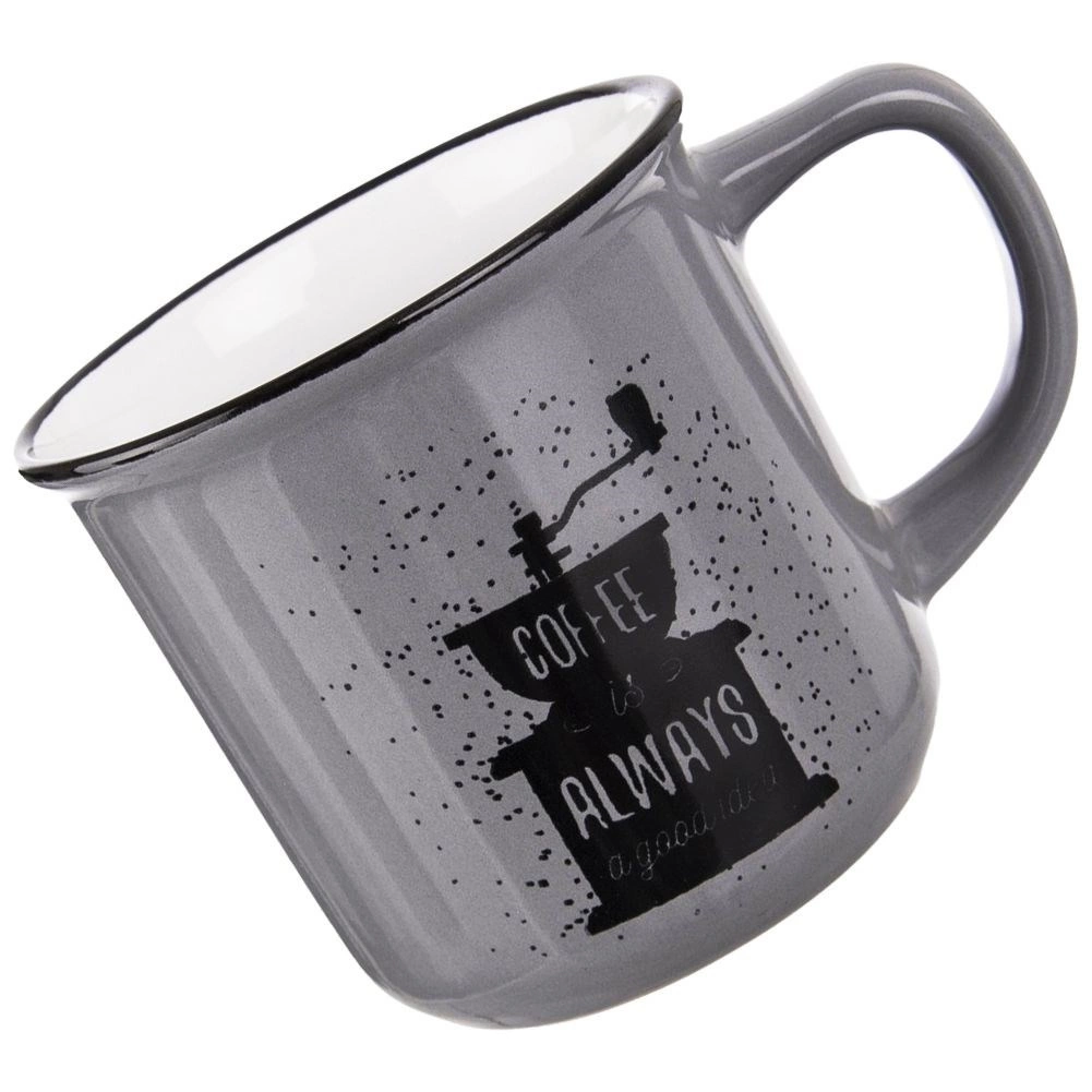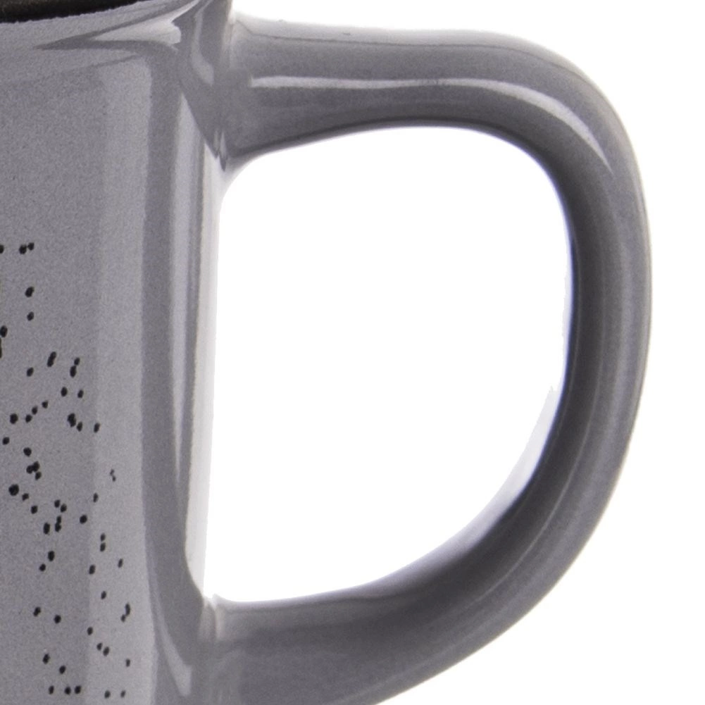 Suprafața gri elegantă este completată de un imprimeu negru cu o râșniță manuală și o inscripție – cana va încânta orice iubitor de cafea și va decora atât bucătăria, cât și biroul.
