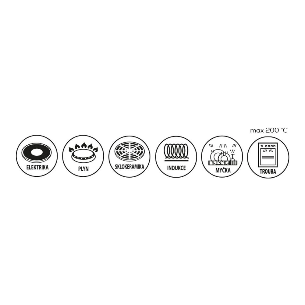 - Utilizare universală – toate tipurile de plite, inclusiv inducție; cuptor fără capac până la 200 °C.