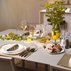 Suprafața albă lucioasă și forma dreptunghiulară oferă mesei tale un aspect modern și curat, care pune în valoare preparatele servite.