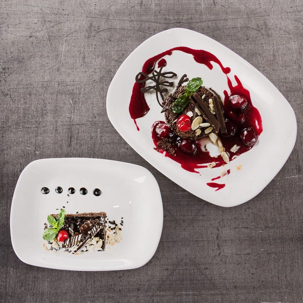 Farfuria dreptunghiulară stilată din sticlă albă evidențiază perfect preparatele și se potrivește natural pe orice masă. Datorită suprafeței netede, lucioase, mâncarea arată impecabil, iar farfuria se curăță ușor.
