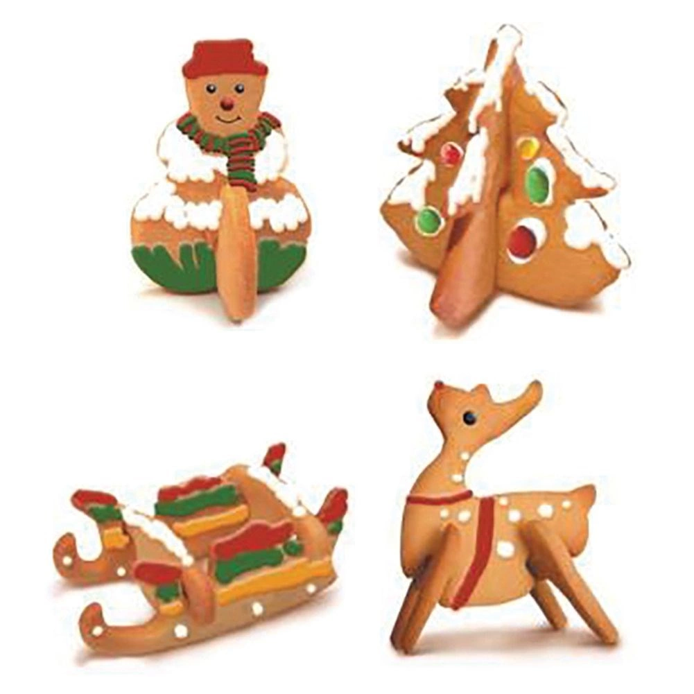 Setul decupează piese care, după coacere, se îmbină și formează figurine în picioare – brăduț, om de zăpadă, ren și săniuță. Ideal pentru coptul festiv și decor.
