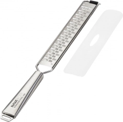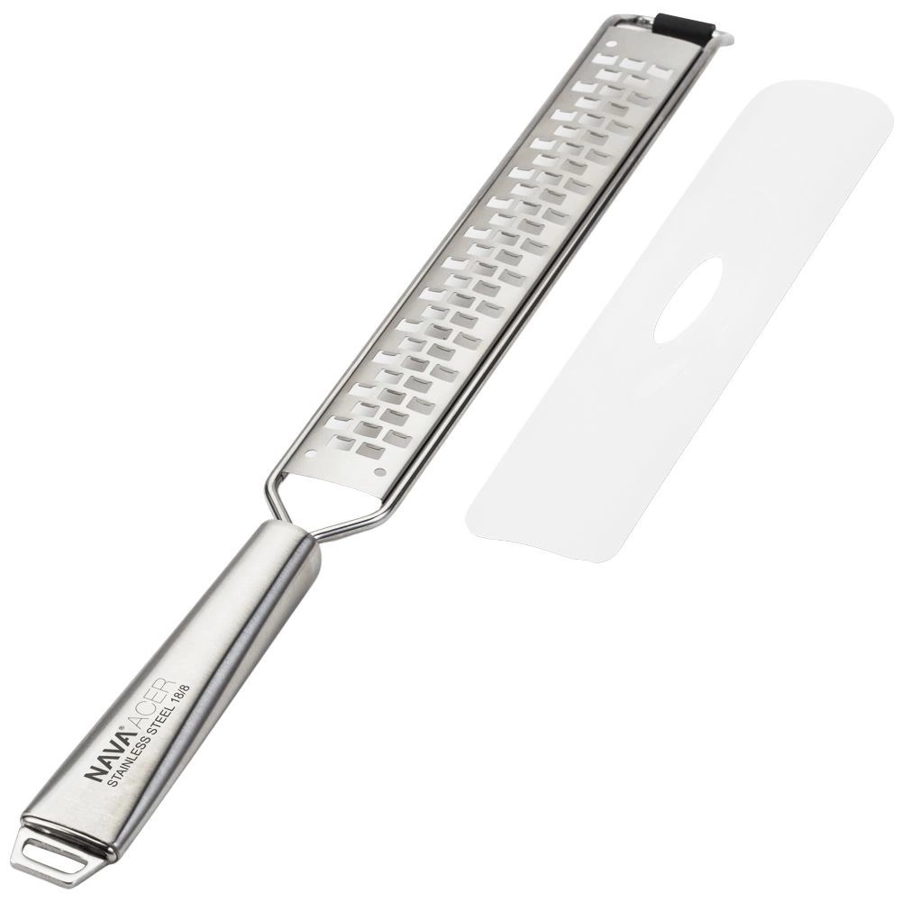 Răzătoarea universală din inox NAVA din gama Acer este concepută pentru răzuire precisă în fâșii fine și fulgi. Corpul lung cu dinți fini face față parmezanului, cojii de citrice, usturoiului, ciocolatei și condimentelor precum ghimbirul, scorțișoara sau nucșoara. Capătul inferior din cauciuc protejează vasele de zgârieturi și sporește stabilitatea în timpul utilizării.