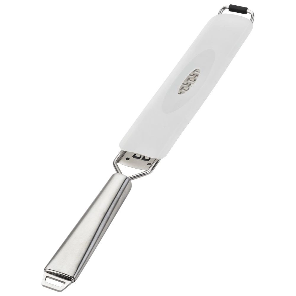 Fabricată din oțel inoxidabil 304 (18/8) durabil pentru o durată lungă de viață și întreținere ușoară. Mâner ergonomic cu orificiu pentru agățare care facilitează depozitarea, iar capacul de protecție protejează muchia și celelalte ustensile din sertar. Răzătoarea se poate spăla în mașina de spălat vase.