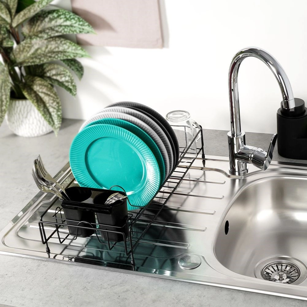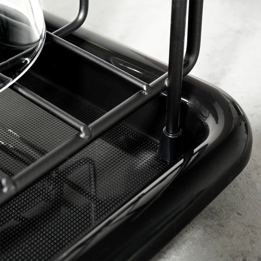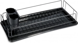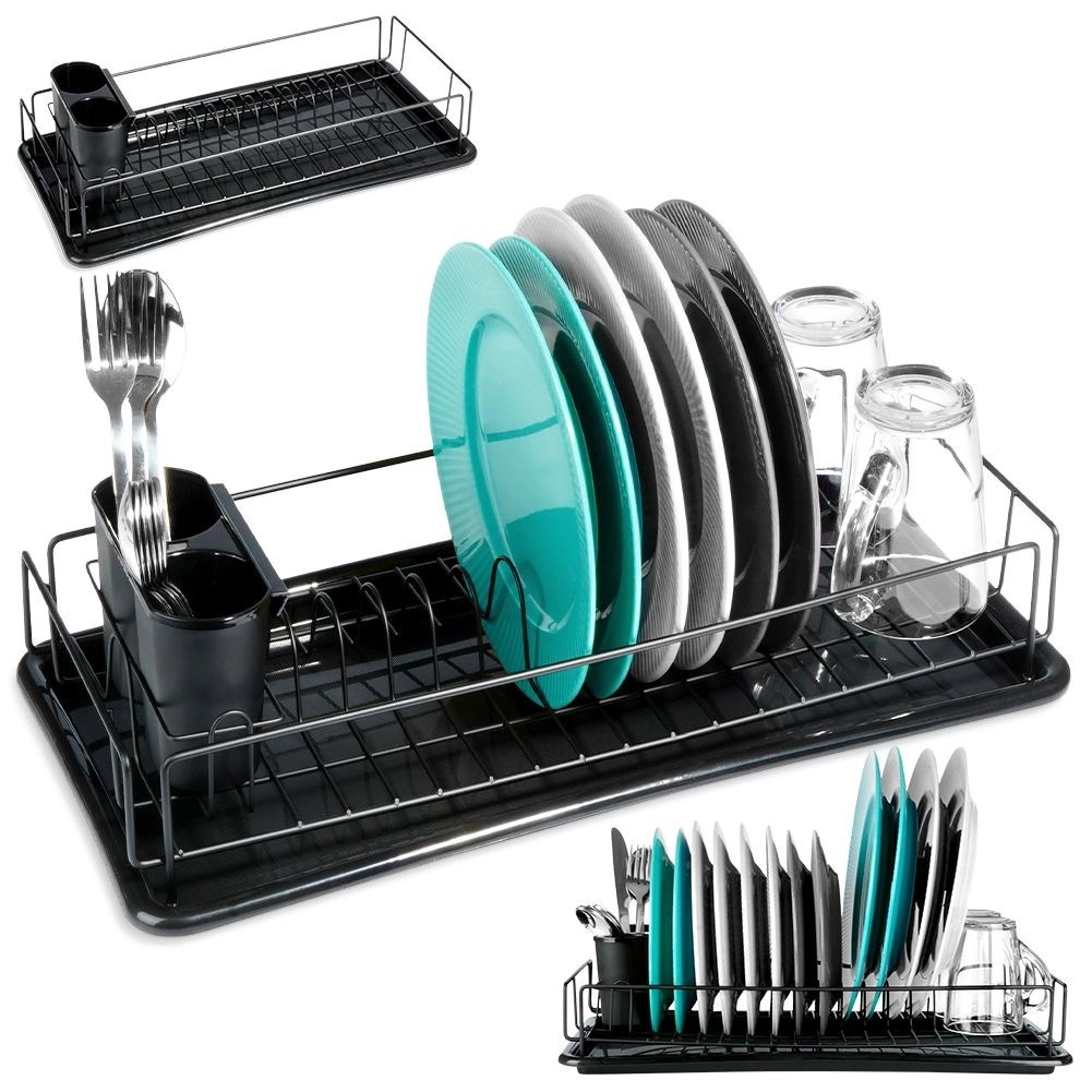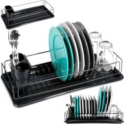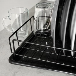 Suportul de scurgere pentru vase, elegant și compact, în culoarea neagră, este un accesoriu practic pentru orice bucătărie. Datorită cadrului metalic robust și tăviței de scurgere din plastic, detașabile, îți păstrează blatul curat și uscat. Dispunerea ingenioasă, cu suporturi pentru farfurii și spațiu pentru căni, asigură o uscare rapidă și igienică.
