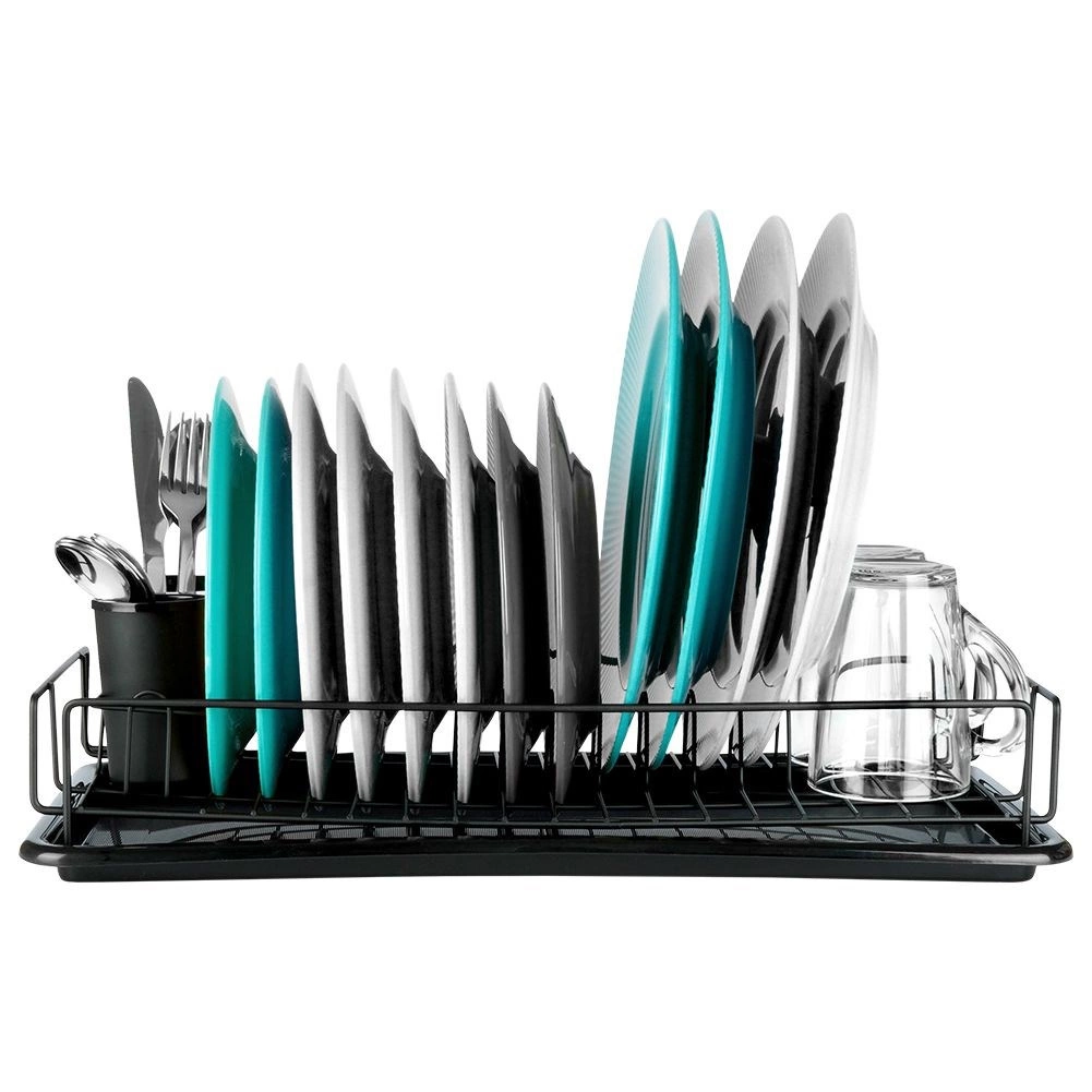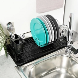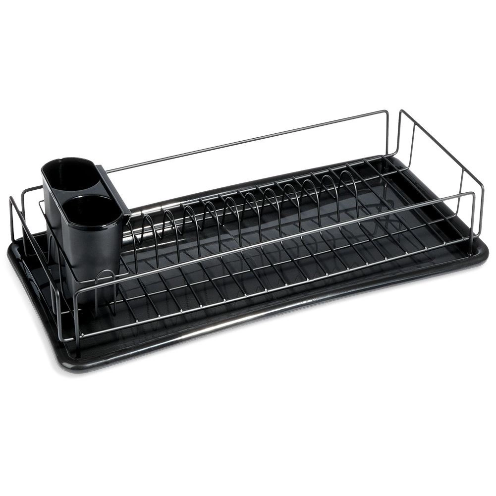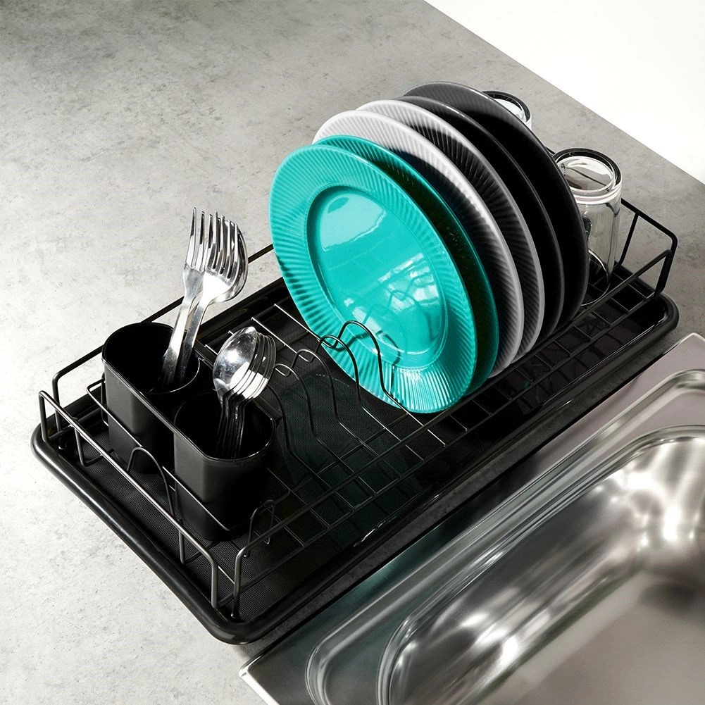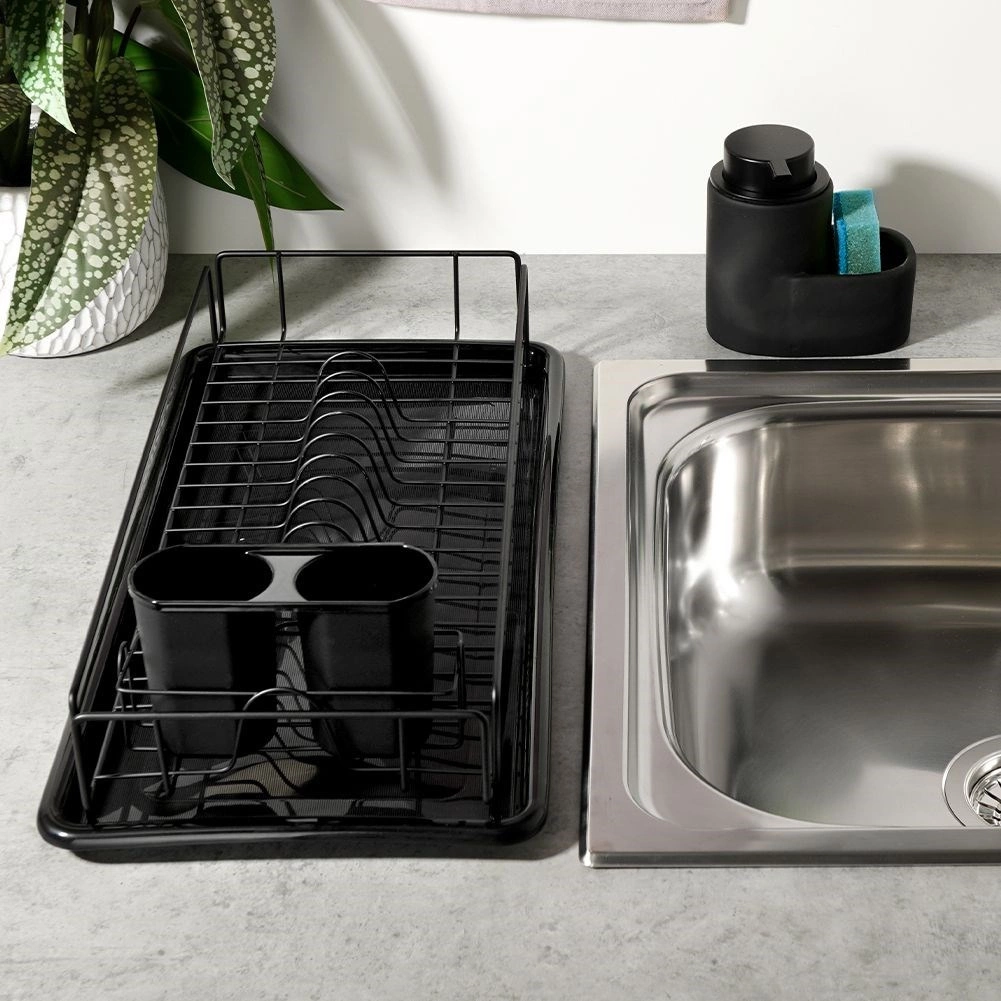 Suportul de scurgere pentru vase, elegant și compact, în culoarea neagră, este un accesoriu practic pentru orice bucătărie. Datorită cadrului metalic robust și tăviței de scurgere din plastic, detașabile, îți păstrează blatul curat și uscat. Dispunerea ingenioasă, cu suporturi pentru farfurii și spațiu pentru căni, asigură o uscare rapidă și igienică.