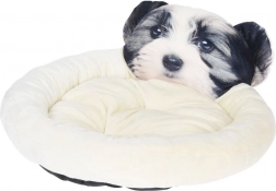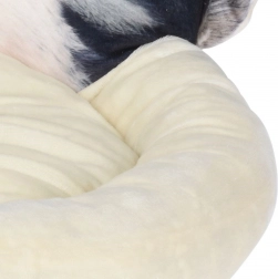 Partea inferioară este din țesătură neagră rezistentă și impermeabilă, care suportă mai bine mutarea și utilizarea zilnică. Patul este ușor, simplu de transportat și, datorită părții frontale jucăușe cu chip de cățel, va deveni un loc preferat pentru somn și un accesoriu decorativ al locuinței tale.