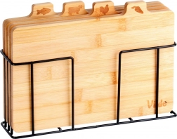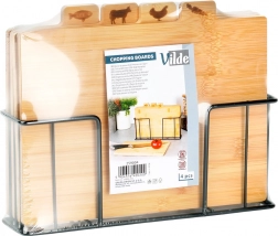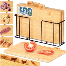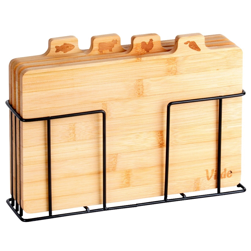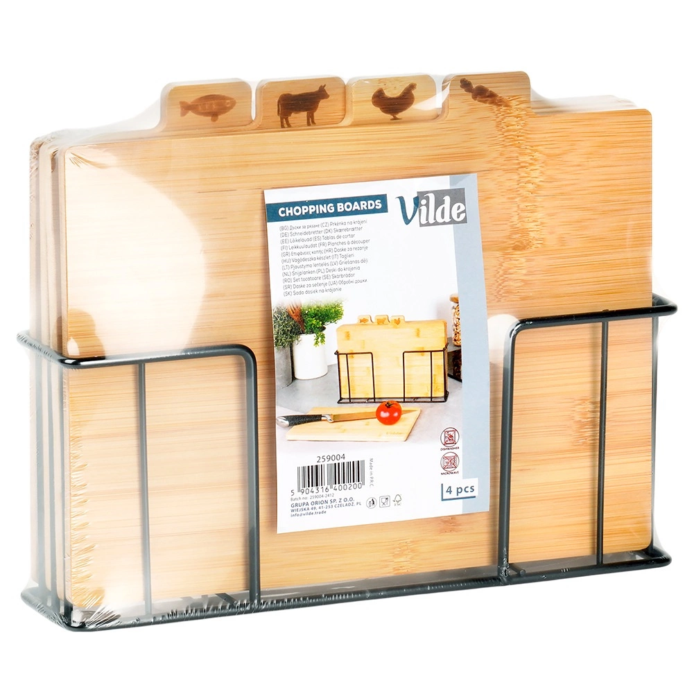 Cu acest set de tocătoare din bambus îți menții bucătăria în perfectă ordine. Cele patru tocătoare separate, cu etichete practice și iconițe, indică clar destinația lor – pentru legume, carne de pasăre, carne și pește – sprijinind astfel pregătirea igienică a alimentelor. Suportul metalic stabil, de culoare neagră, asigură că tocătoarele sunt mereu la îndemână și depozitate ordonat.