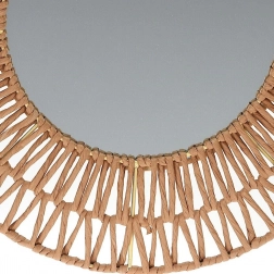 Această oglindă rotundă de perete este un accesoriu de design în stil natural. Rama din hârtie împletită pe o structură metalică solidă creează o textură de efect, care se evidențiază în interioare cu influențe boho, scandinave sau de minimalism modern. Tonurile neutre bej-gri se combină ușor cu diverse culori și materiale.