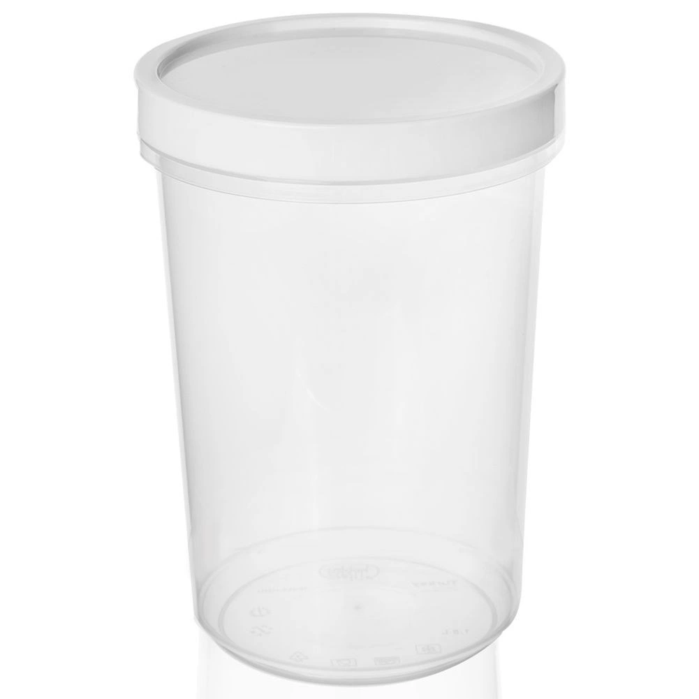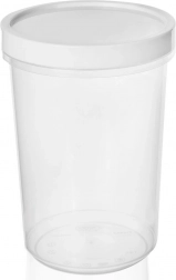 Cutie rotundă universală din plastic de calitate, cu corp transparent, permite verificarea rapidă a conținutului fără deschidere. Capac alb filetat cu garnitură integrată care previne vărsarea și menține mâncarea proaspătă mai mult timp. Datorită dimensiunilor compacte (înălțime aprox. 15,5 cm, diametru aprox. 11 cm) încape comod în geantă și pe raftul frigiderului.