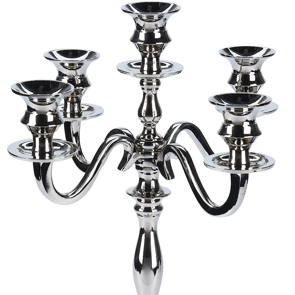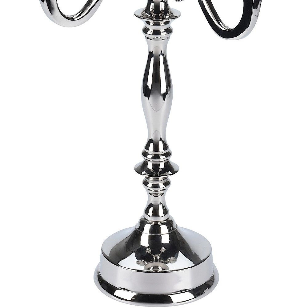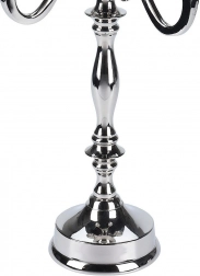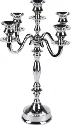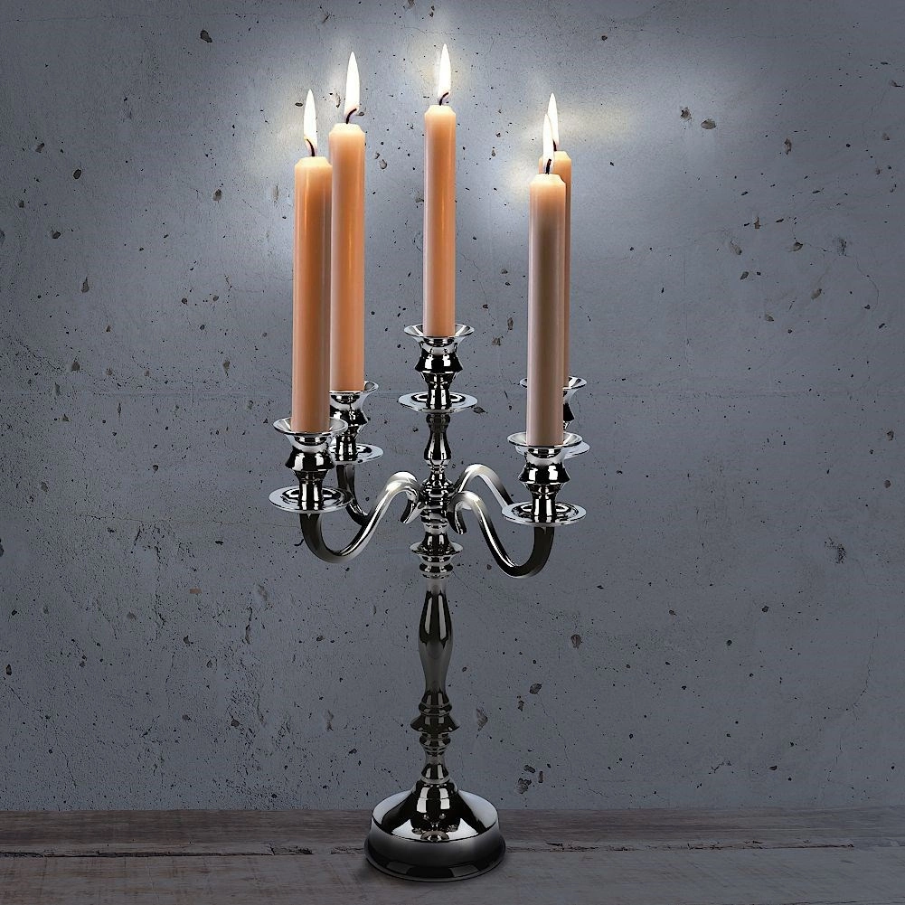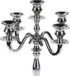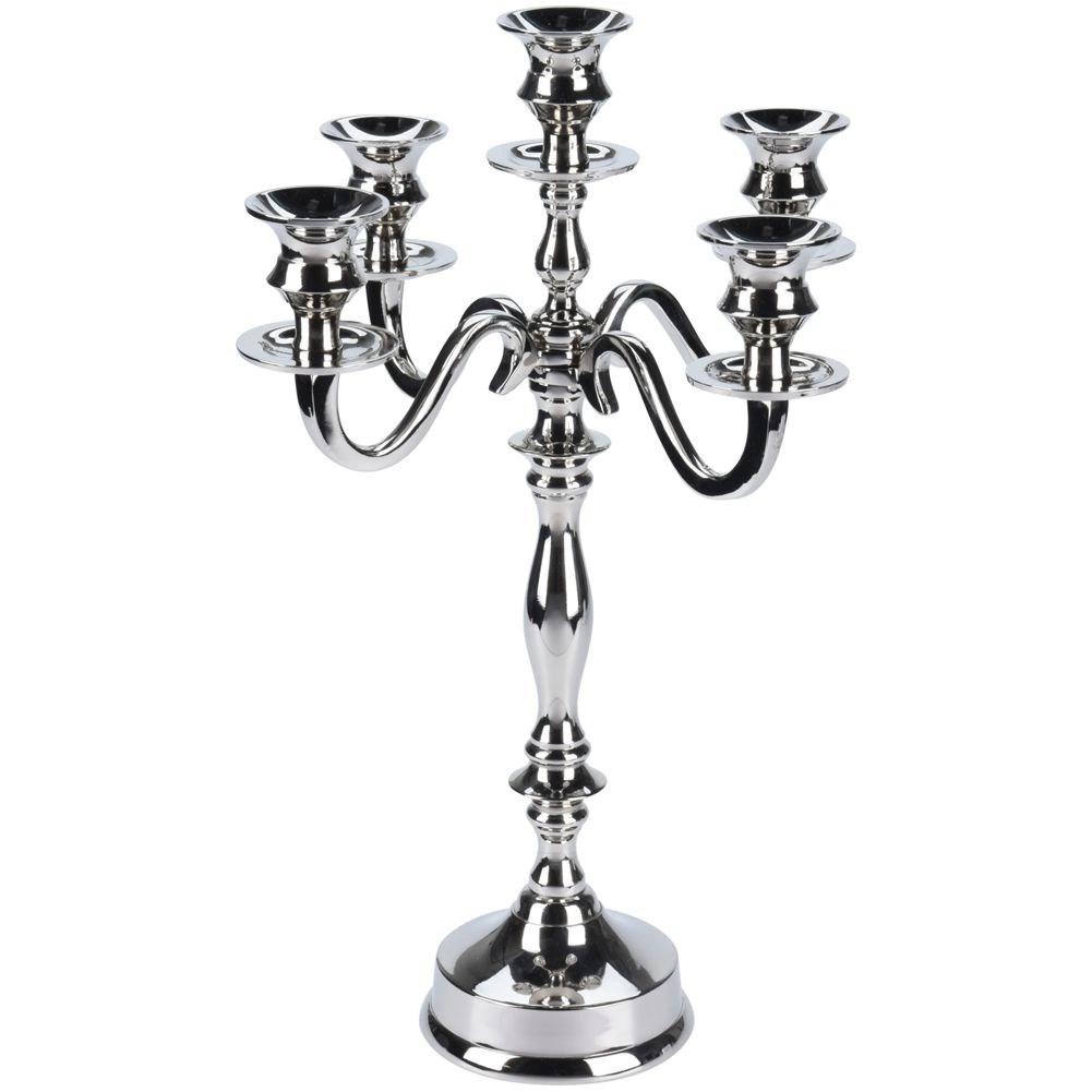 Acest candelabru cu cinci brațe, cu un design atemporal, este realizat din metal durabil, cu un finisaj argintiu înalt lustruit. Se evidențiază ca element central pe masa de dining, pe comodă sau pe polita șemineului și transformă fiecare seară într-o atmosferă stilată și romantică.