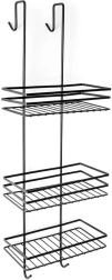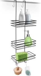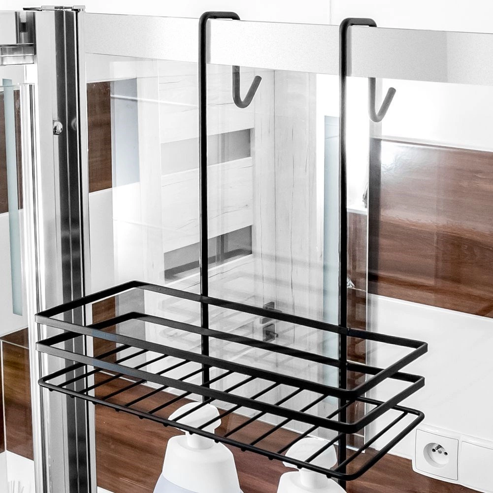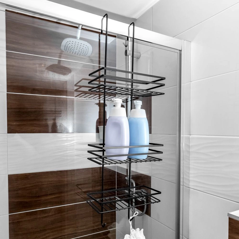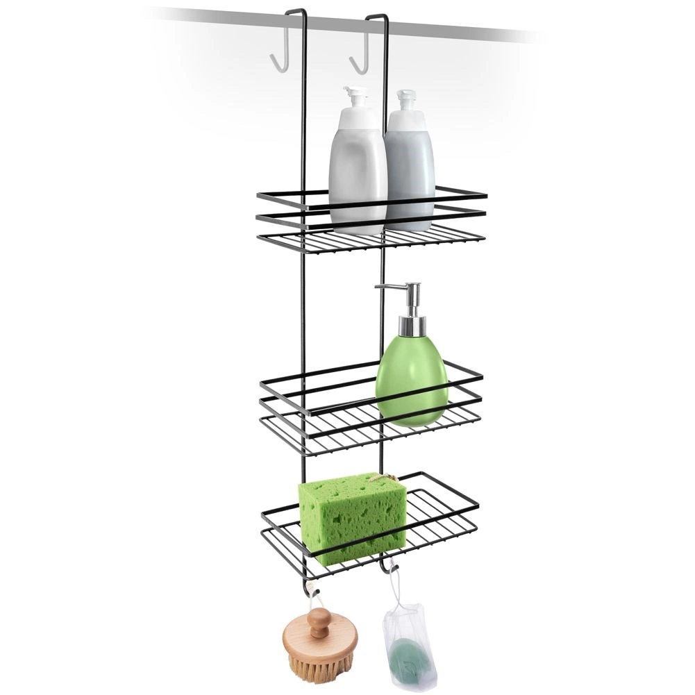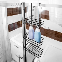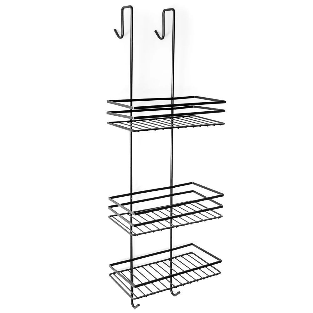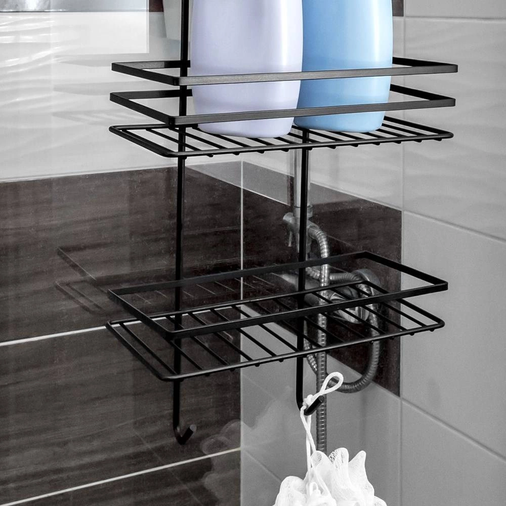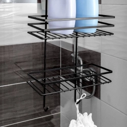 Raftul practic de duș suspendat, în elegantul negru, păstrează toate necesarele la îndemână și bine organizate. Oferă trei rafturi spațioase pentru șampoane și geluri, patru cârlige pentru bureți și perii și montaj fără găurire, prin agățare peste marginea superioară a ușilor de sticlă ale dușului. Metalul durabil cu vopsea pulbere asigură o durată lungă de viață și întreținere ușoară.