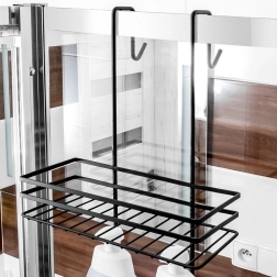 Raftul oferă 3 niveluri de depozitare pentru șampoane, balsamuri, săpunuri și chiar recipiente mai mari, precum și 4 cârlige practice – două în interior pentru bureți și perii și două la exterior pentru prosoape sau halate. Se agață simplu pe marginea superioară a panoului de sticlă al cabinei de duș și se îndepărtează la fel de ușor oricând.