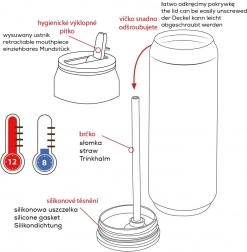 Capacul cu guriță rabatabilă și pai interior permite băutul confortabil fără înclinare. Designul atractiv cu motiv DAKAR îi va încânta pe toți iubitorii de rally și călătorii. Pentru performanțe optime, recomandăm să preîncălziți cana cu apă fierbinte sau să o răciți cu apă rece timp de cca 5 minute înainte de utilizare și să o umpleți maximum până la 90% din volum.