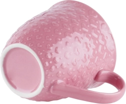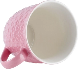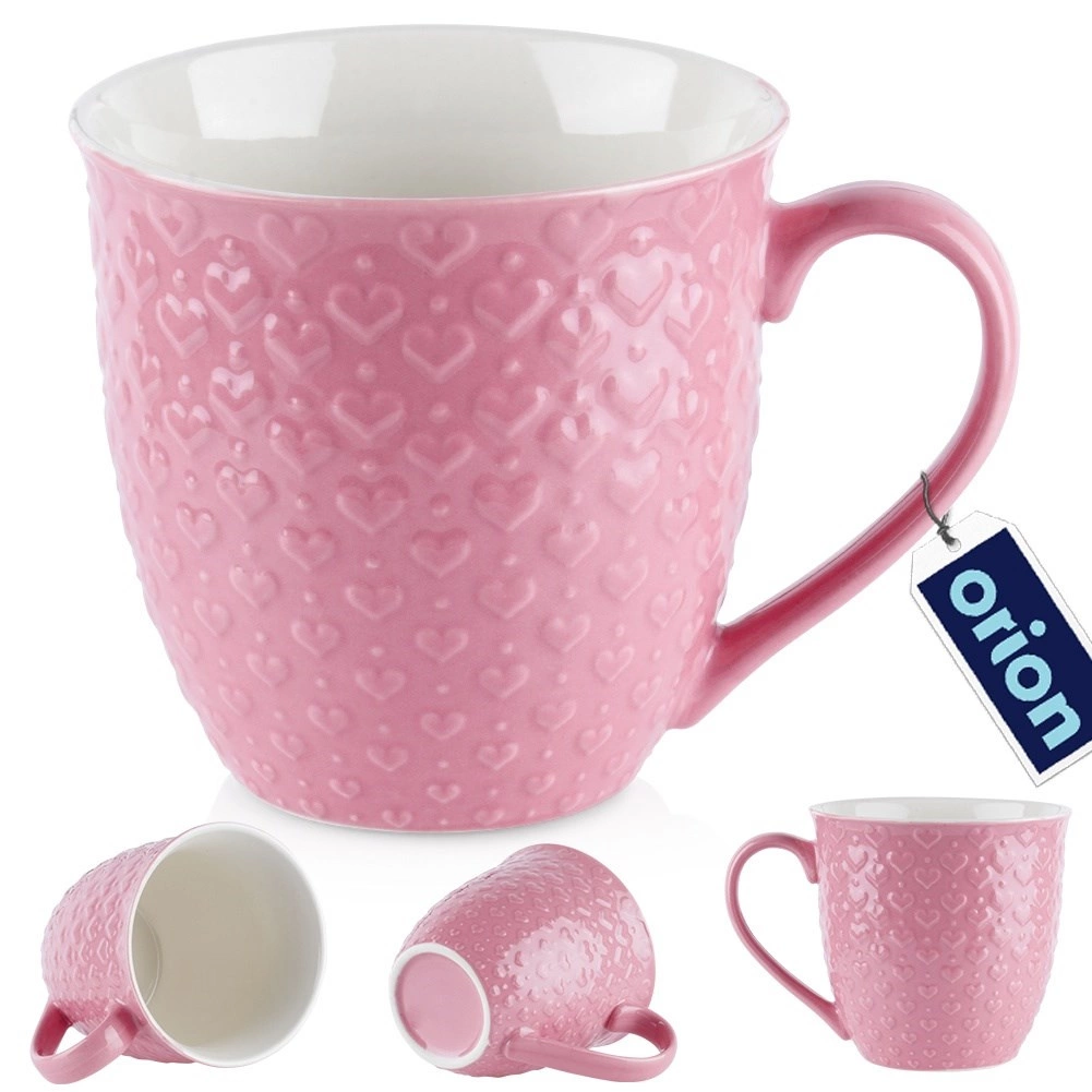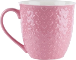 Cană roz mare, cu volum de 580 ml, pentru iubitorii de cafea și ceai. Are construcție ceramică solidă, toartă confortabilă și decor în relief cu inimioare. Potrivită pentru mașina de spălat vase și cuptorul cu microunde, ideală pentru uz zilnic sau ca cadou stilat.