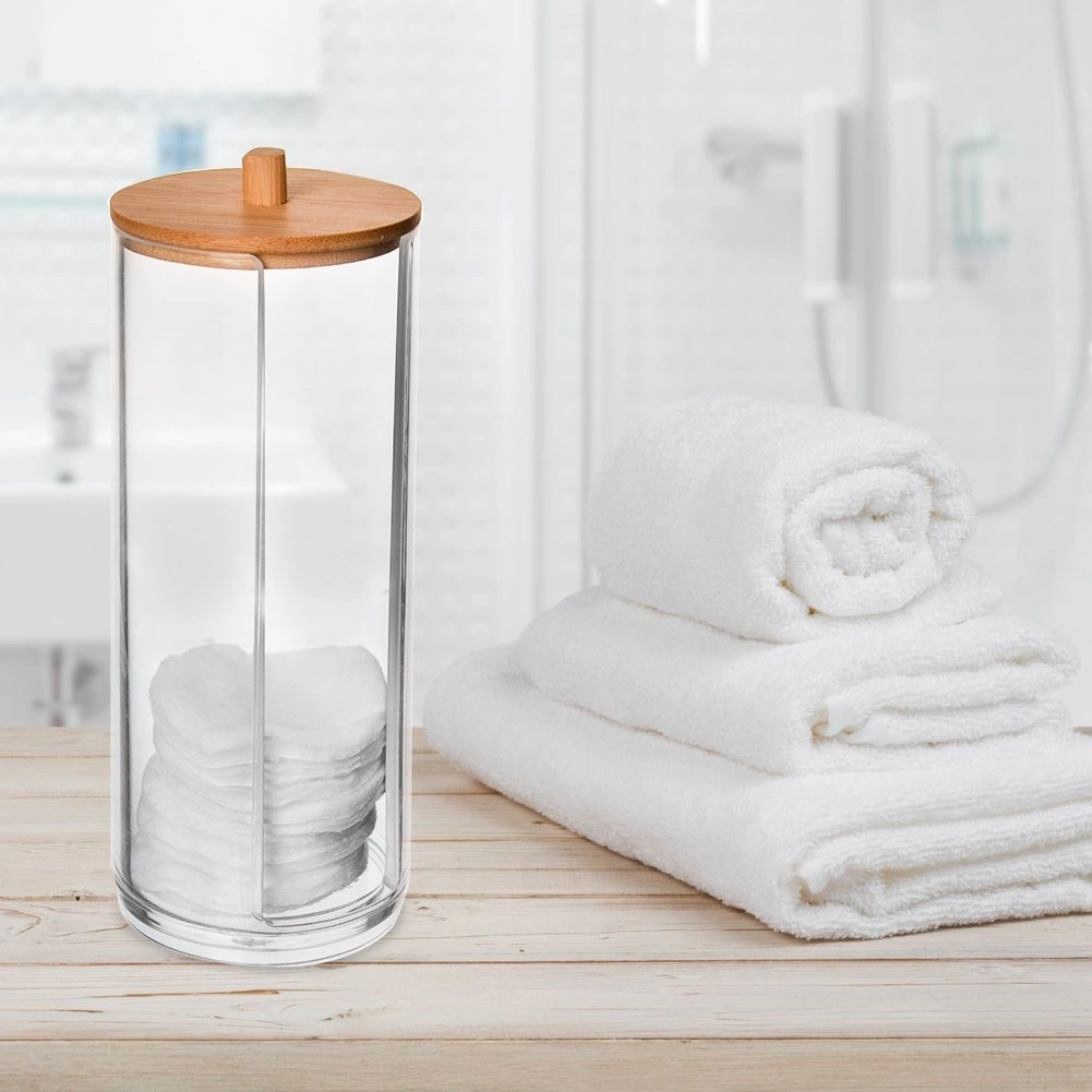 Combinația de acril de calitate și capac din bambus natural conferă băii un aspect modern și natural. În plus, capacul protejează de praf și umiditate, astfel dischetele sunt mereu igienic pregătite.