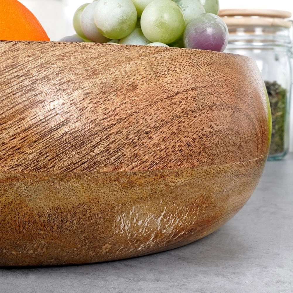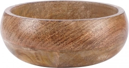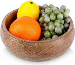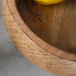 Acest bol din lemn de mango îmbină funcționalitatea cu estetica. Este ideal pentru servirea nucilor, chipsurilor, popcornului, fructelor uscate și proaspete. Datorită nuanței naturale și texturii pronunțate a lemnului, se potrivește cu orice aranjament de masă și funcționează singur ca element decorativ.