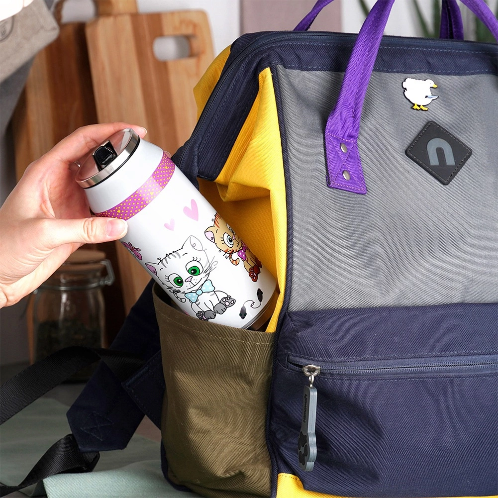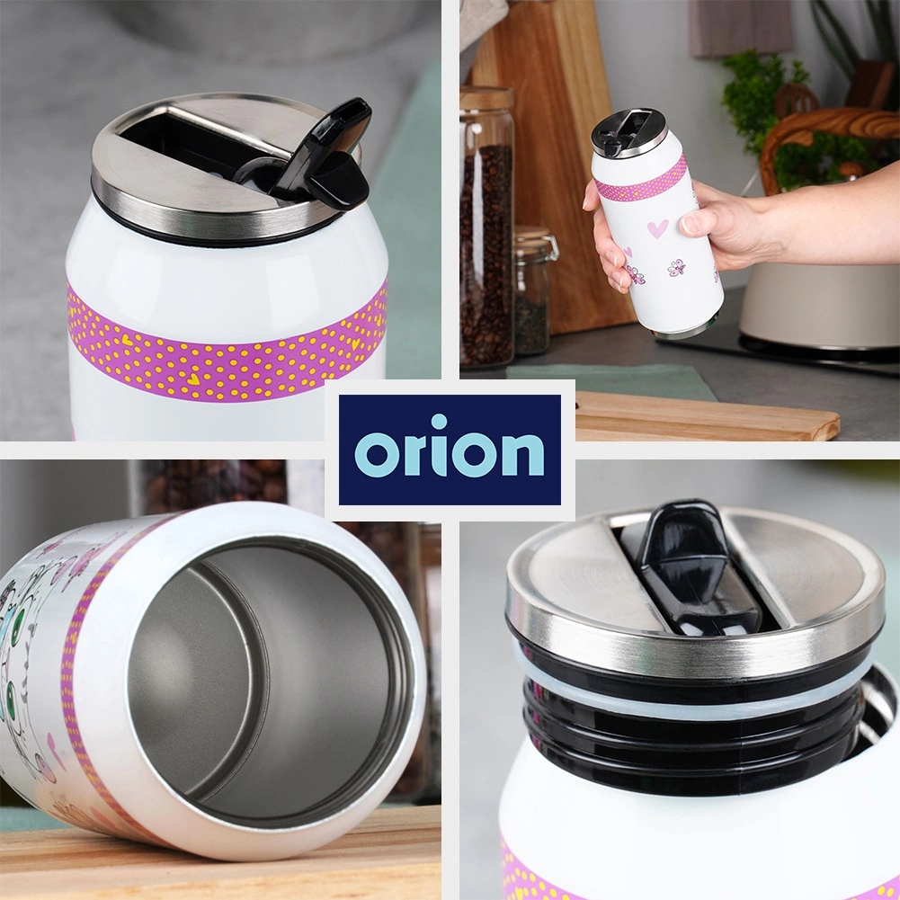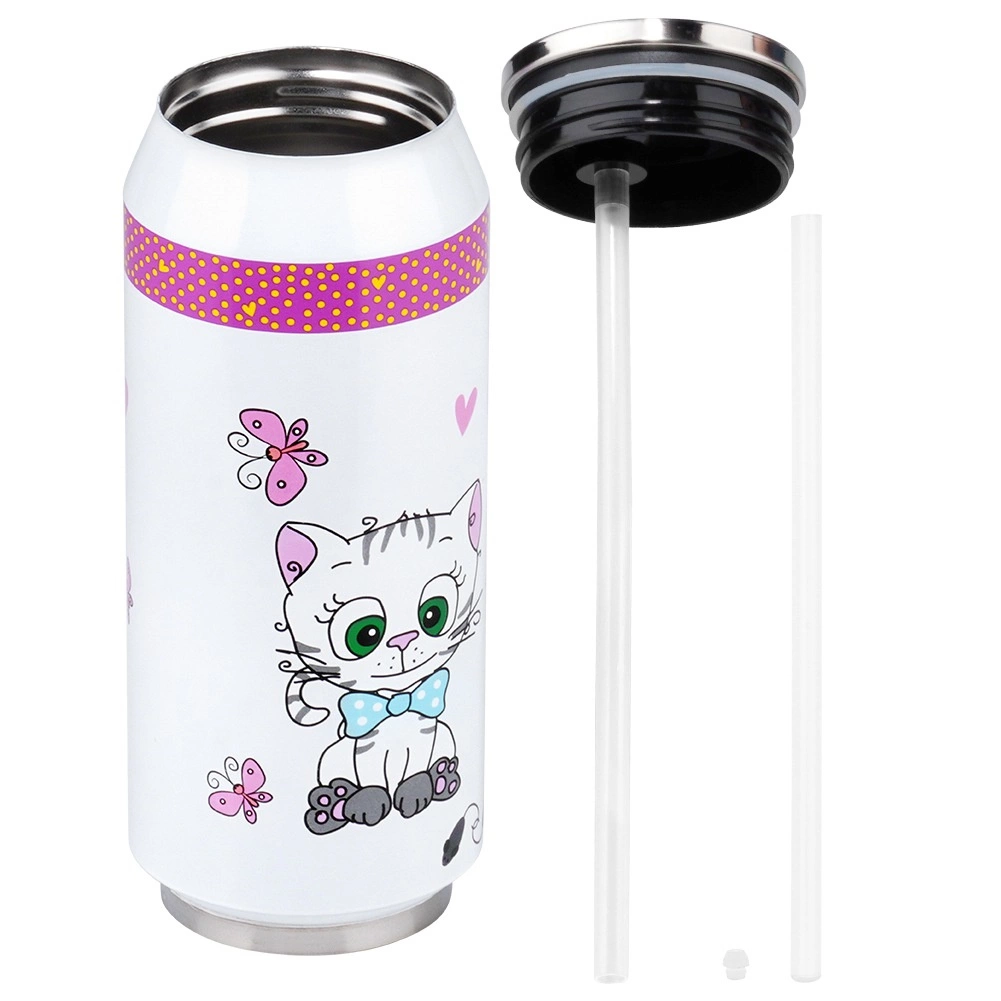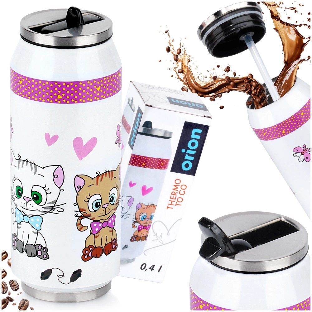 Cană termică practică și drăguț proiectată, ce amintește de o doză, ideală pentru călătorii, birou și utilizare zilnică. Datorită construcției din oțel inoxidabil și izolației în vid menține fiabil temperatura băuturilor preferate. Motivul cu pisicuțe încântă atât copiii, cât și adulții.