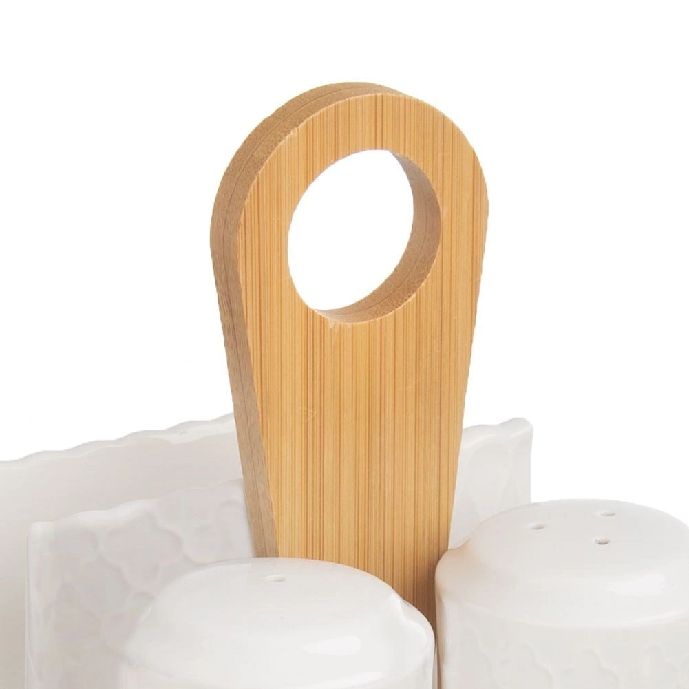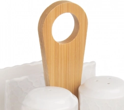 Acest set WHITELINE din 3 piese îmbină designul rafinat și funcționalitatea pentru mesele de zi cu zi sau pentru ocazii festive. Două recipiente din porțelan pentru sare și piper sunt completate de un suport pentru șervețele, toate așezate pe o bază solidă din bambus, cu mâner practic.