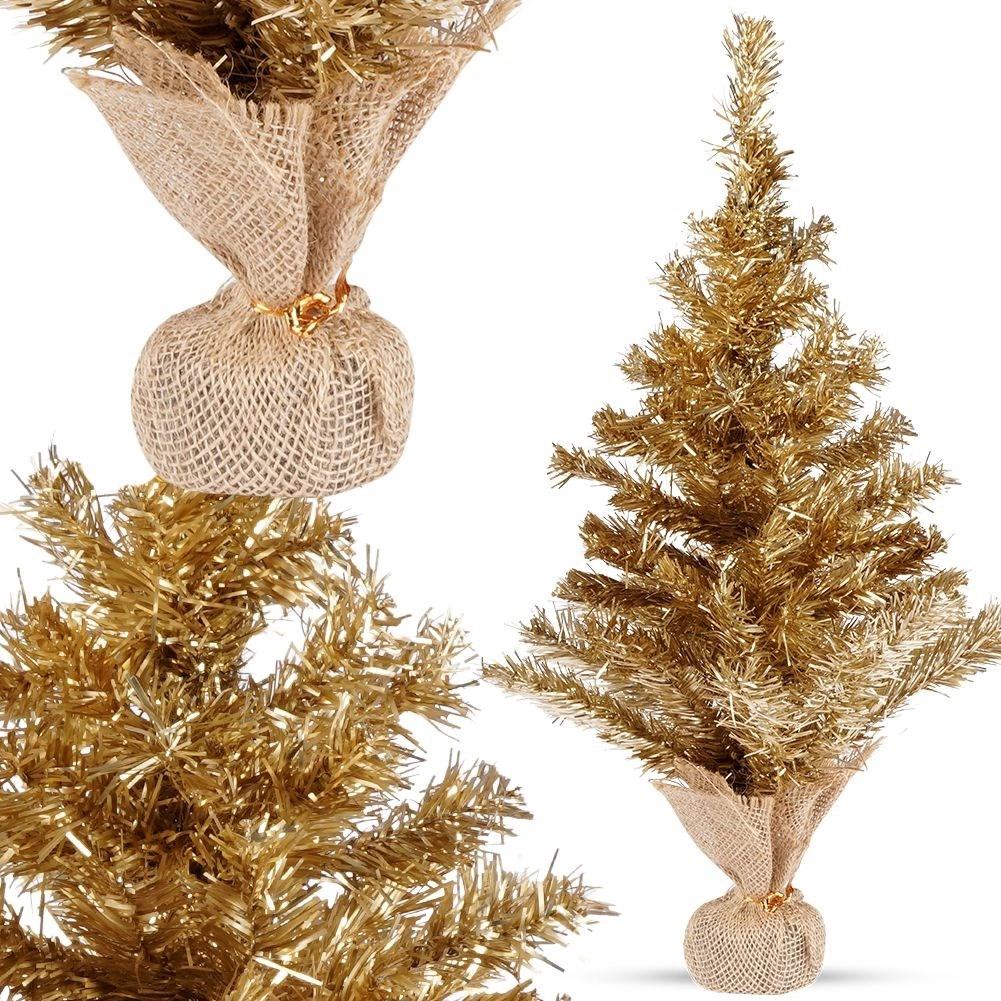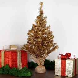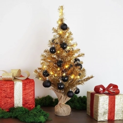 Acest brad artificial compact, în nuanță luxoasă de auriu, este ideal pentru apartament, birou și spații mai mici. Datorită miezului metalic solid și bazei stabile din beton, învelită în iută, stă în siguranță și se amplasează ușor pe masă, raft sau pervaz.