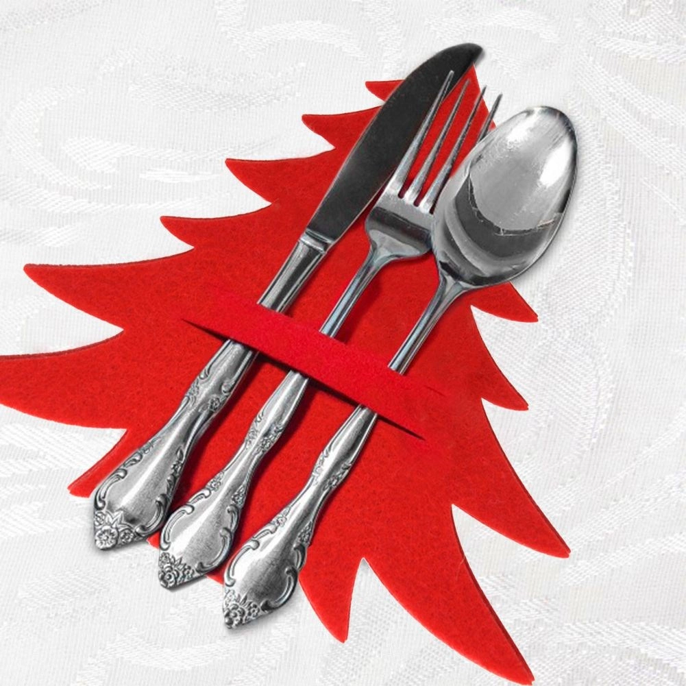 Set de 4 huse decorative pentru tacâmuri în formă de brăduț de Crăciun, din fetru roșu ferm. Datorită tăieturii orizontale, păstrați în siguranță și ordonat lingura, furculița și cuțitul într-un singur loc. Un accesoriu stilat care subliniază imediat atmosfera festivă la orice masă.