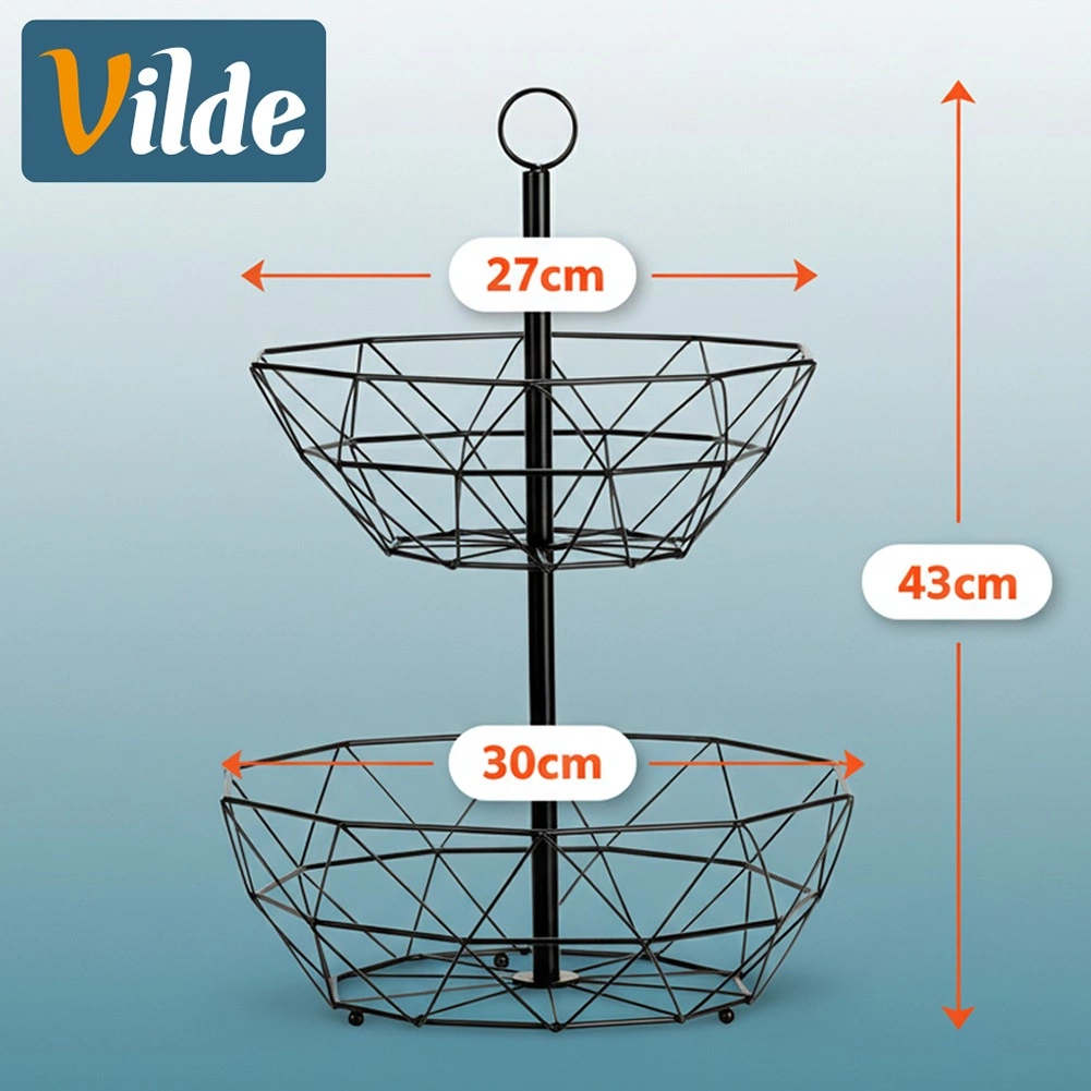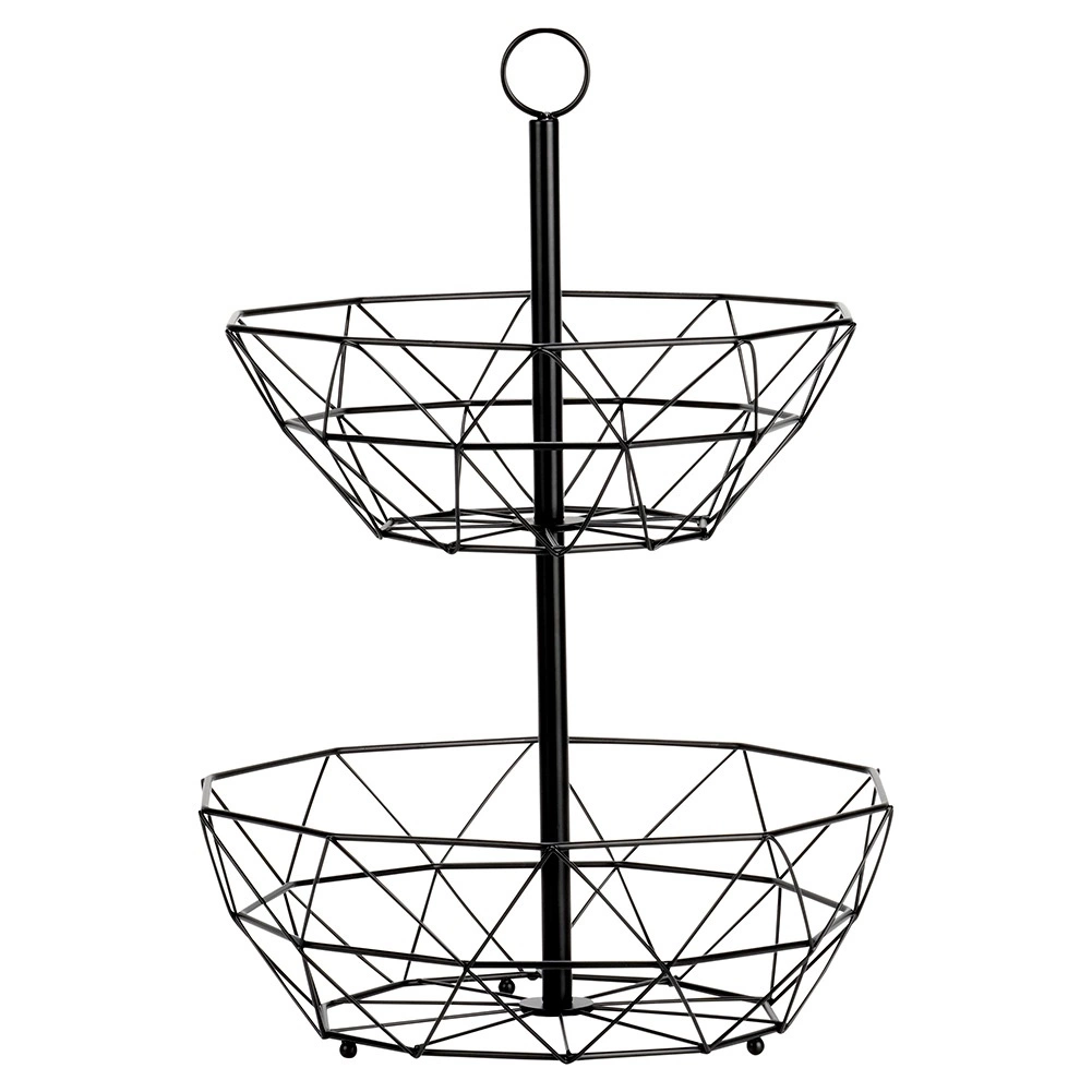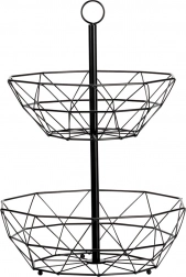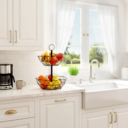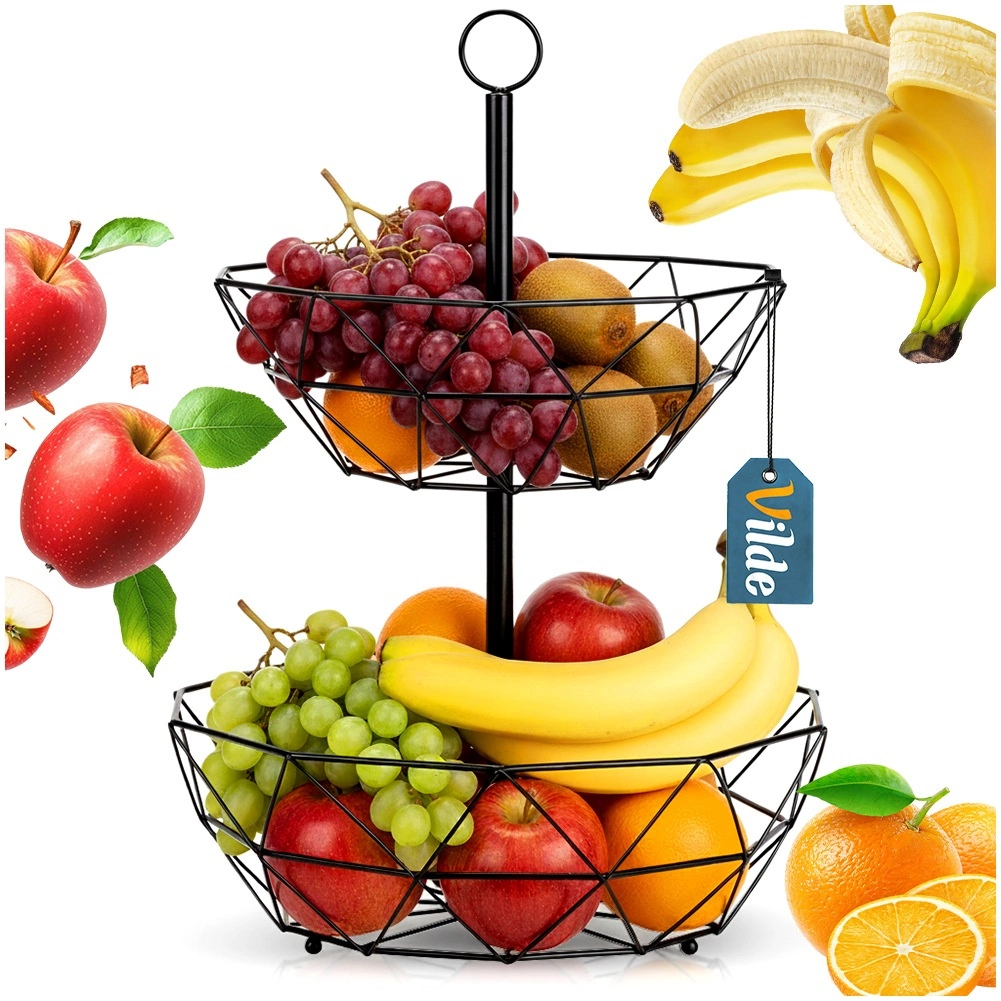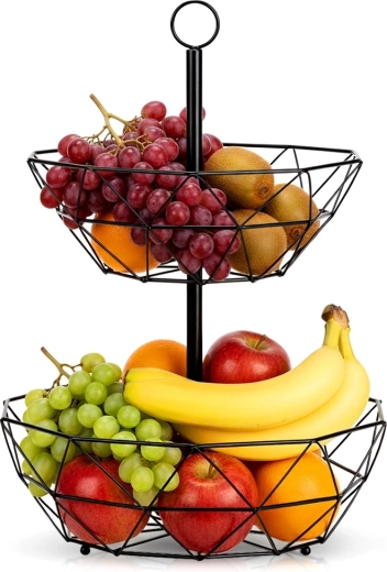 Coșul metalic pe două niveluri este o soluție excelentă pentru depozitare ordonată și igienică a fructelor, legumelor și mărunțișurilor din bucătărie sau sufragerie. Structura deschisă susține circulația aerului, astfel încât fructele rămân proaspete mai mult timp, iar organizarea pe verticală economisește prețiosul spațiu de pe blat.