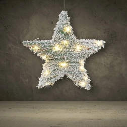 Această stea decorativă de Crăciun îmbină aspectul natural din nuiele cu crenguțe artificiale de conifer cu efect de zăpadă. LED-urile alb cald integrate luminează uniform forma stelei și creează o lumină plăcută, primitoare pentru serile de iarnă. Datorită diametrului de 30 cm, iese în evidență în orice interior, fie că o agăți pe ușă, la fereastră sau o sprijini pe un raft.