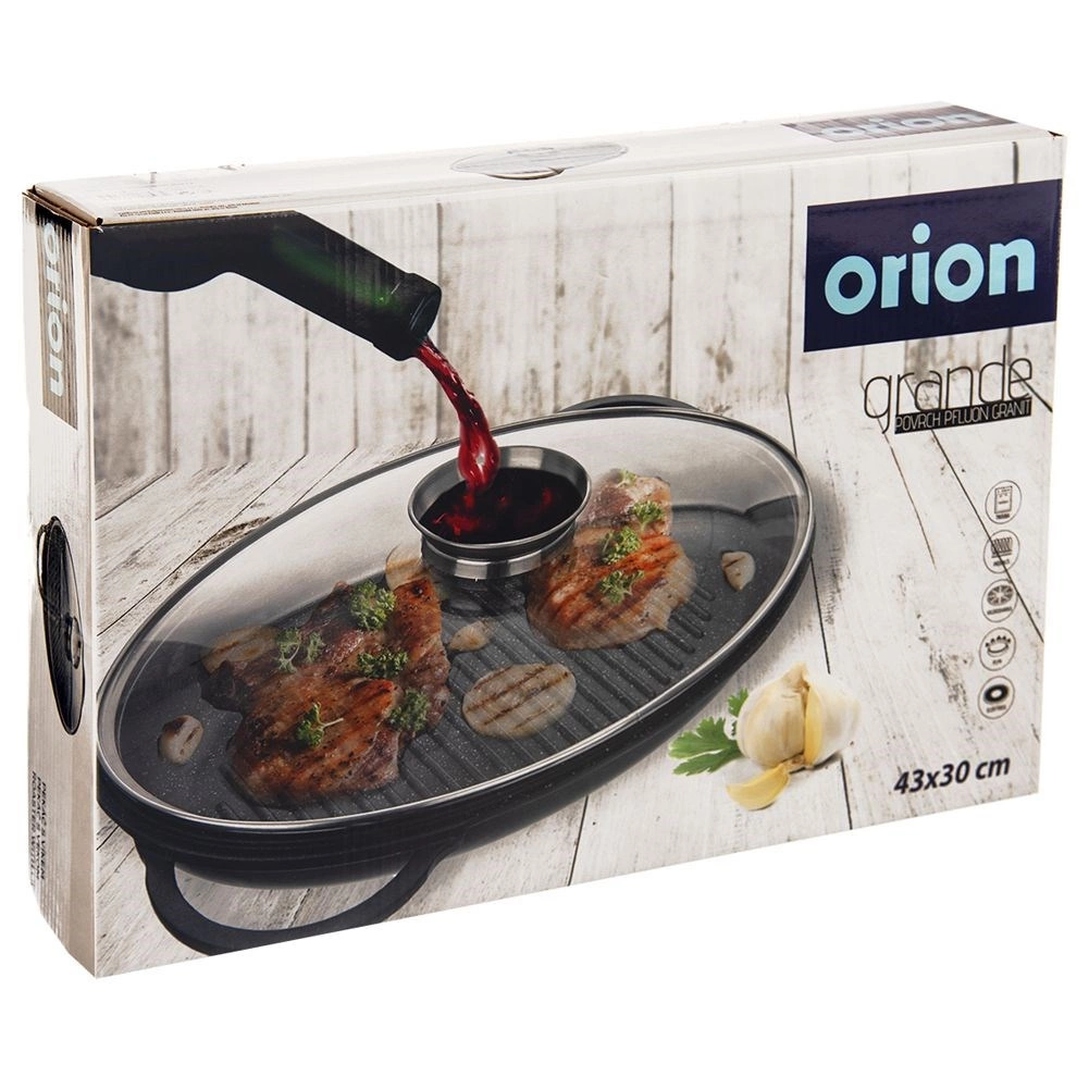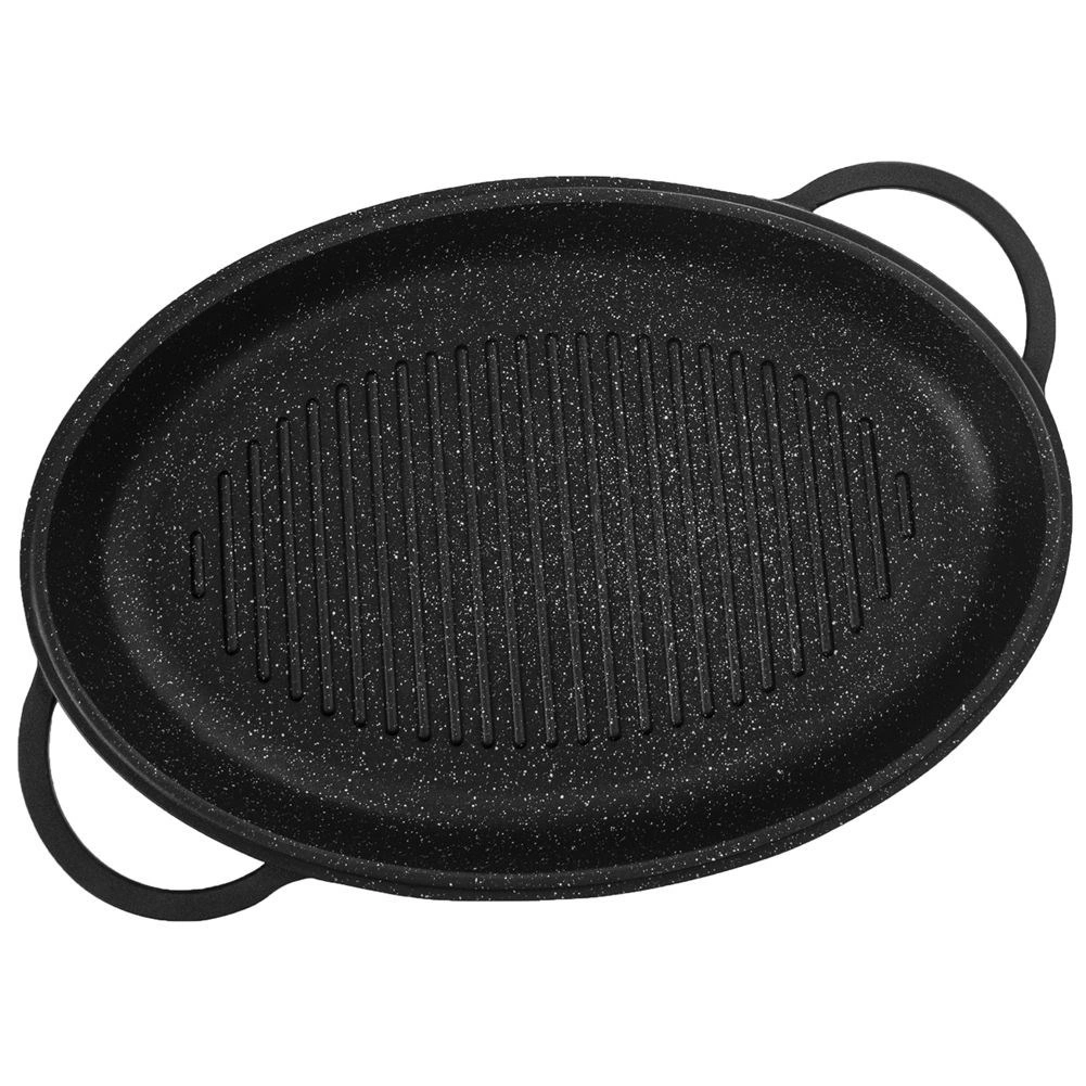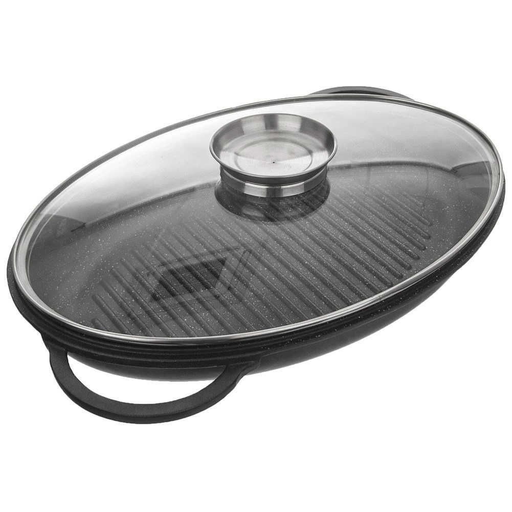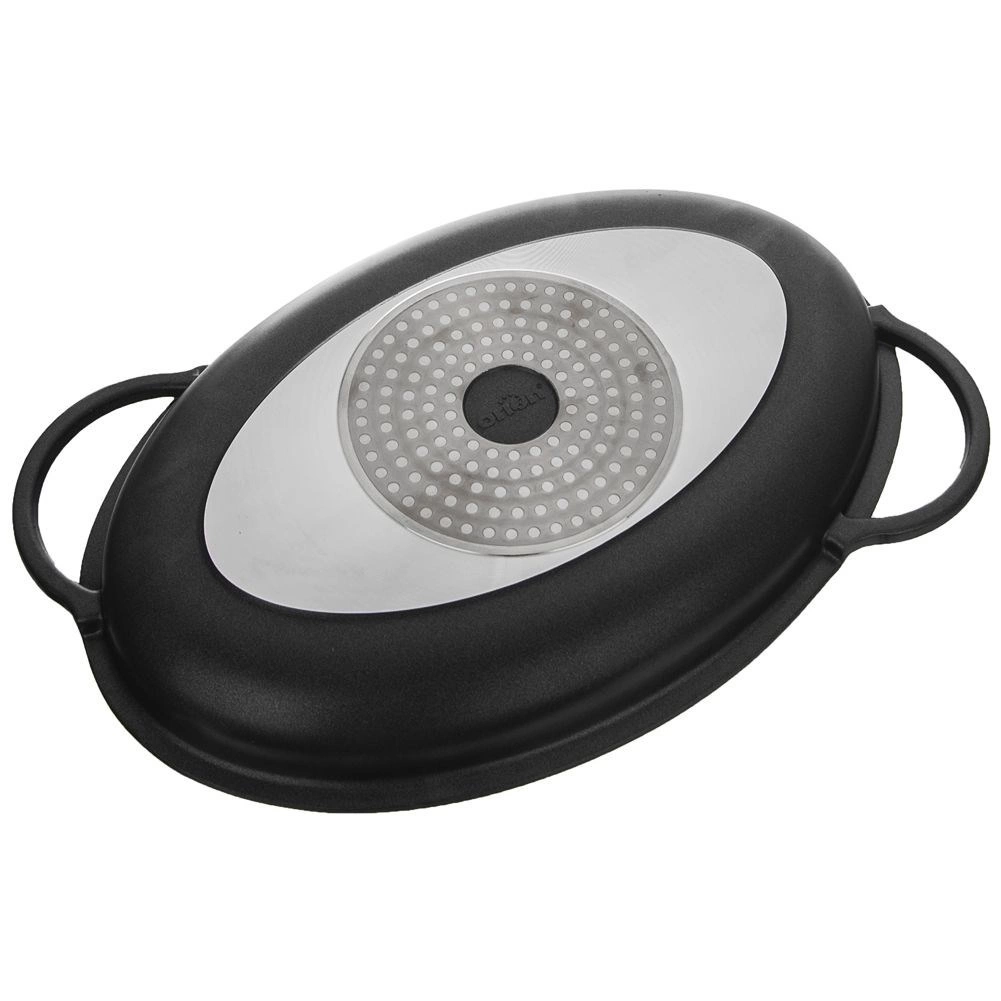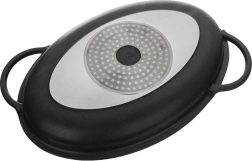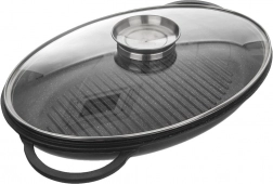 Descoperiți tigaia-grătar universală care îmbină funcția tigăii cu cea a tăvii de copt. Forma ovală cu nervuri înălțate creează dungi de grătar spectaculoase și evacuează excesul de grăsime, iar capacul din sticlă cu dozator integrat permite turnarea vinului sau a supei fără a ridica capacul. Ideală pentru carne, pește și legume, pentru sotare, înăbușire și coacere.