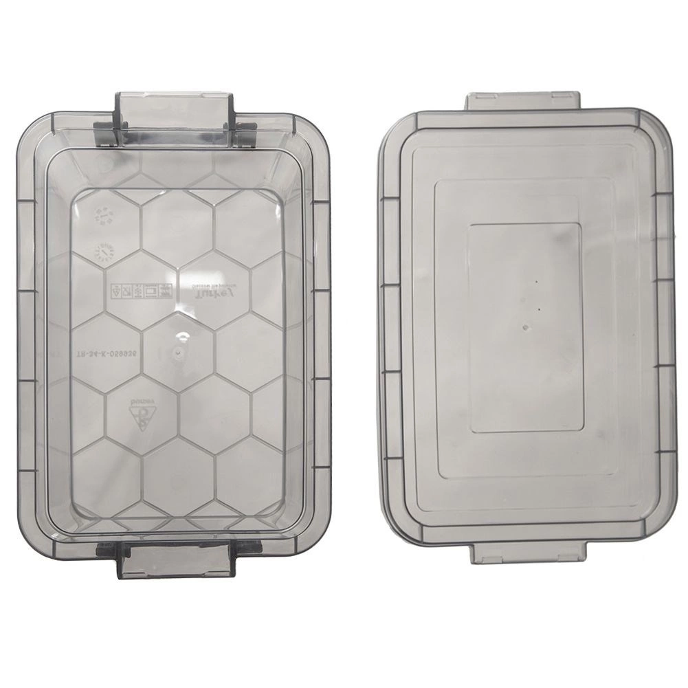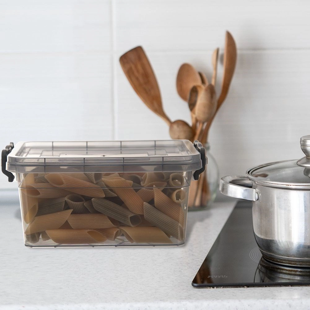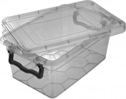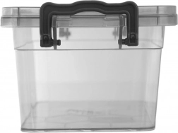Cutie practică de depozitare din plastic de calitate, sigur pentru sănătate, în variantă transparentă gri închis care permite controlul imediat al conținutului fără a deschide. Datorită capacului solid cu două cleme laterale, totul rămâne în siguranță închis și protejat de umiditate și impurități.