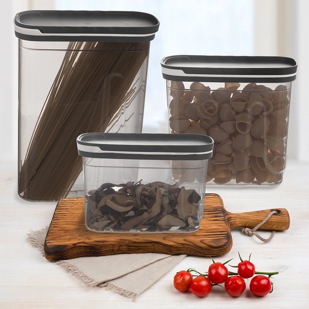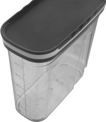 Recipient practic pentru alimente vrac, cu volum de 1,8 l, care asigură ordine în bucătărie și dozare precisă. Are corp transparent de culoare gri închis, capac cu dozator și riglă laterală. Este fabricat din material durabil, sigur pentru sănătate, fără BPA și este potrivit pentru mașina de spălat vase, frigider, congelator și cuptorul cu microunde (fără capac). Ideal pentru făină, zahăr, arpacaș, cereale și alte ingrediente vrac.