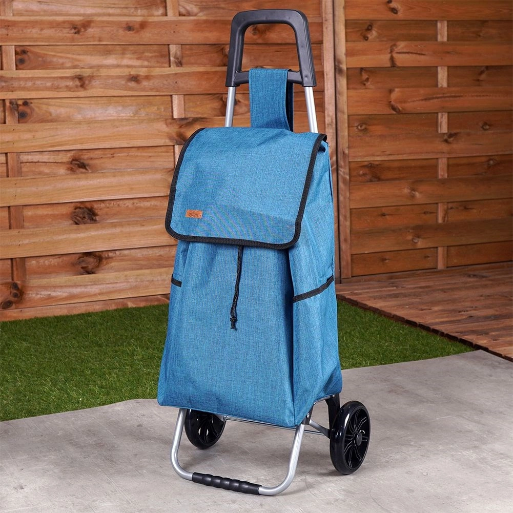 Căruciorul de cumpărături ușor, dar rezistent, este util la fiecare cumpărătură și în călătorii. Mânerul ergonomic, suportul stabil și cele două roți mari facilitează manevrarea și parcarea. Geanta albastră, într-o nuanță elegantă marin, este detașabilă și ușor de curățat.
