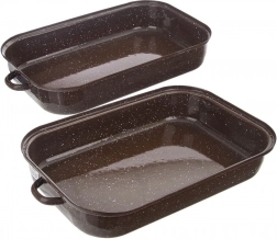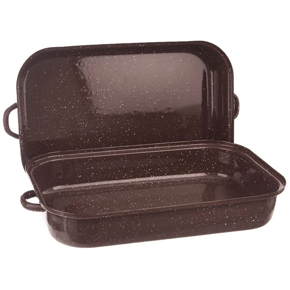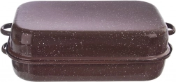 Tava de copt emailată, cu volum mare, cu capac, dimensiuni 46 × 27,5 × 14,5 cm, oferă până la 2 vase separate pentru coacere și servire. Oțel emailat durabil, culoare maro, compatibil cu toate tipurile de plite, inclusiv inducție, cu comportament antiaderent pentru curățare ușoară și posibilitate de spălare în mașina de spălat vase. Produs original marca ORION.