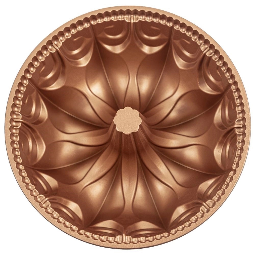 Această formă decorativă pentru guguluf, cu aspect de cupru, este ideală pentru coptul zilnic și pentru deserturi de sărbătoare. Datorită construcției din aluminiu conduce foarte bine căldura, iar cu stratul dublu antiaderent PFLUON veți răsturna ușor chiar și aluaturi fine, fără lipire.