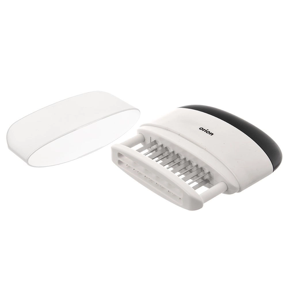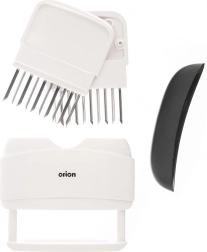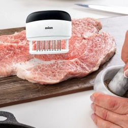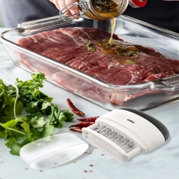 Accesoriul de bucătărie compact are mâner ergonomic pentru o priză confortabilă și un capac de siguranță detașabil pentru depozitare sigură. Corpul este din plastic de calitate, iar acele din oțel inoxidabil sunt potrivite pentru contactul cu alimentele. Este suficient să-l așezați pe carne și să apăsați – rapid, curat și eficient.