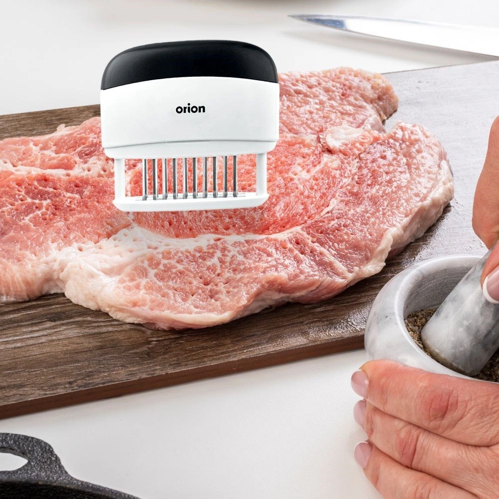 Ușurați-vă pregătirea fripturilor, șnițelelor și a cărnii la cuptor. Acest înțepător de carne cu 20 de ace din inox perforează în profunzime fibrele musculare, scurtând timpul de gătire, finisează textura și permite ca marinada să pătrundă uniform în interior. Rezultatul este un gust mai intens și o suculență sporită.