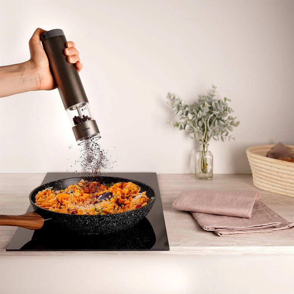 Doar apeși și râșnița macină. Datorită formei ergonomice, o poți folosi confortabil chiar și cu o singură mână direct deasupra tigăii sau a farfuriei.