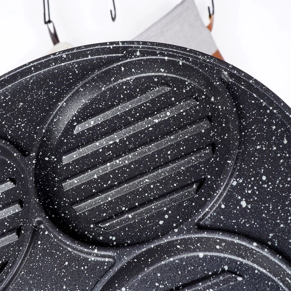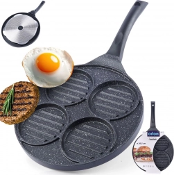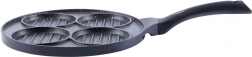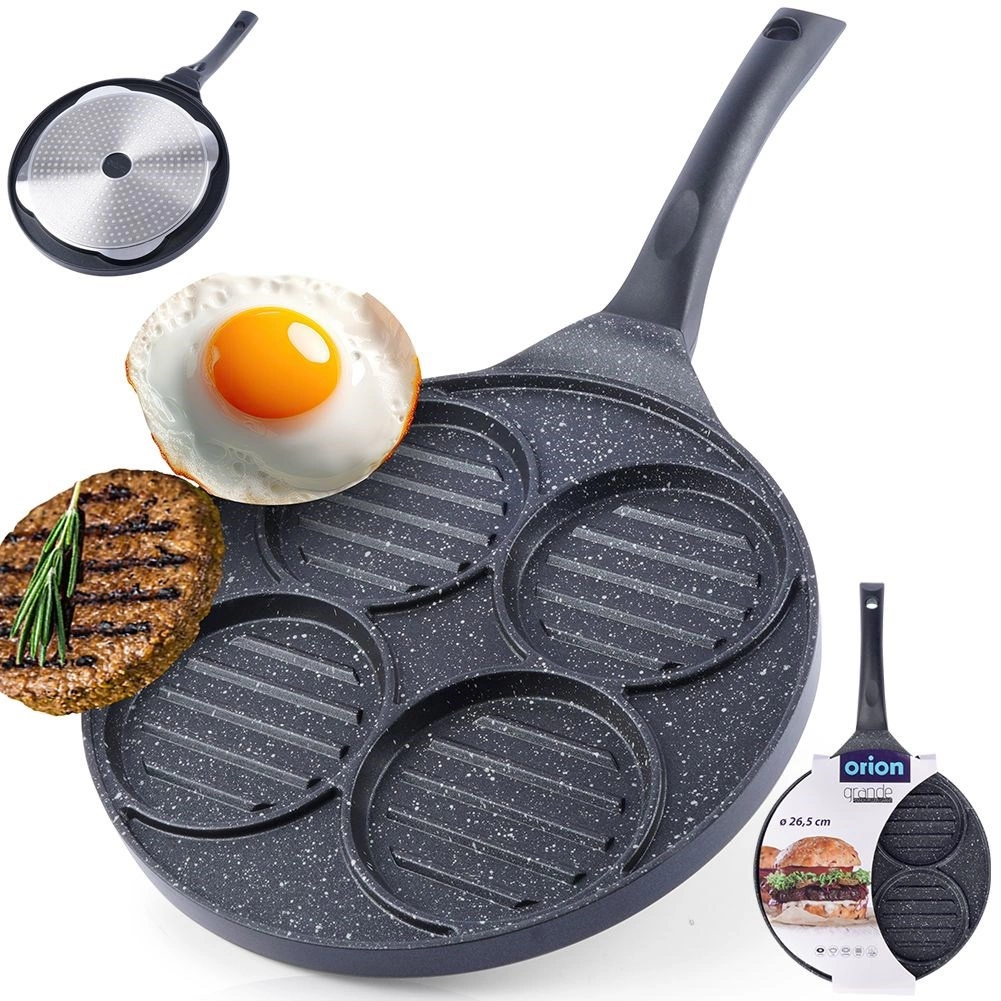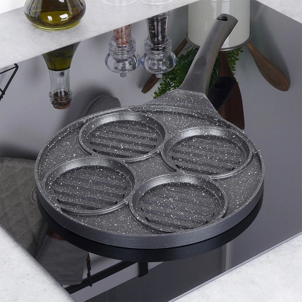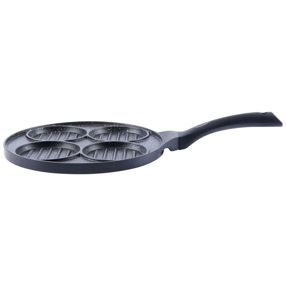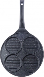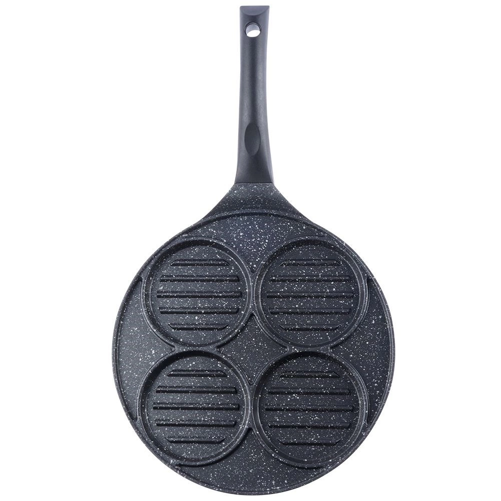 Această tigaie multifuncțională, cu diametrul de 26,5 cm și patru secțiuni circulare separate (fiecare cca 10 cm), îți permite să prepari burgeri, ochiuri, clătite sau chifteluțe de legume simultan, fără amestec de arome. Stratul antiaderent din granit PFLUON GRANIT asigură lipire minimă, consum redus de ulei și curățare ușoară.
