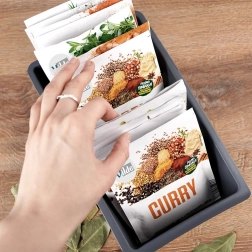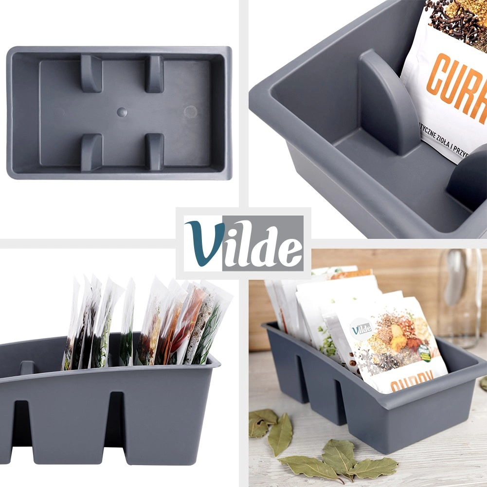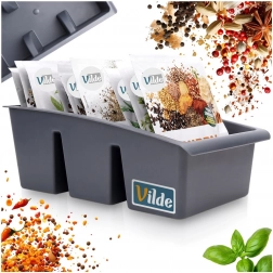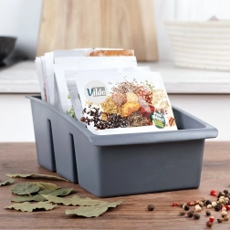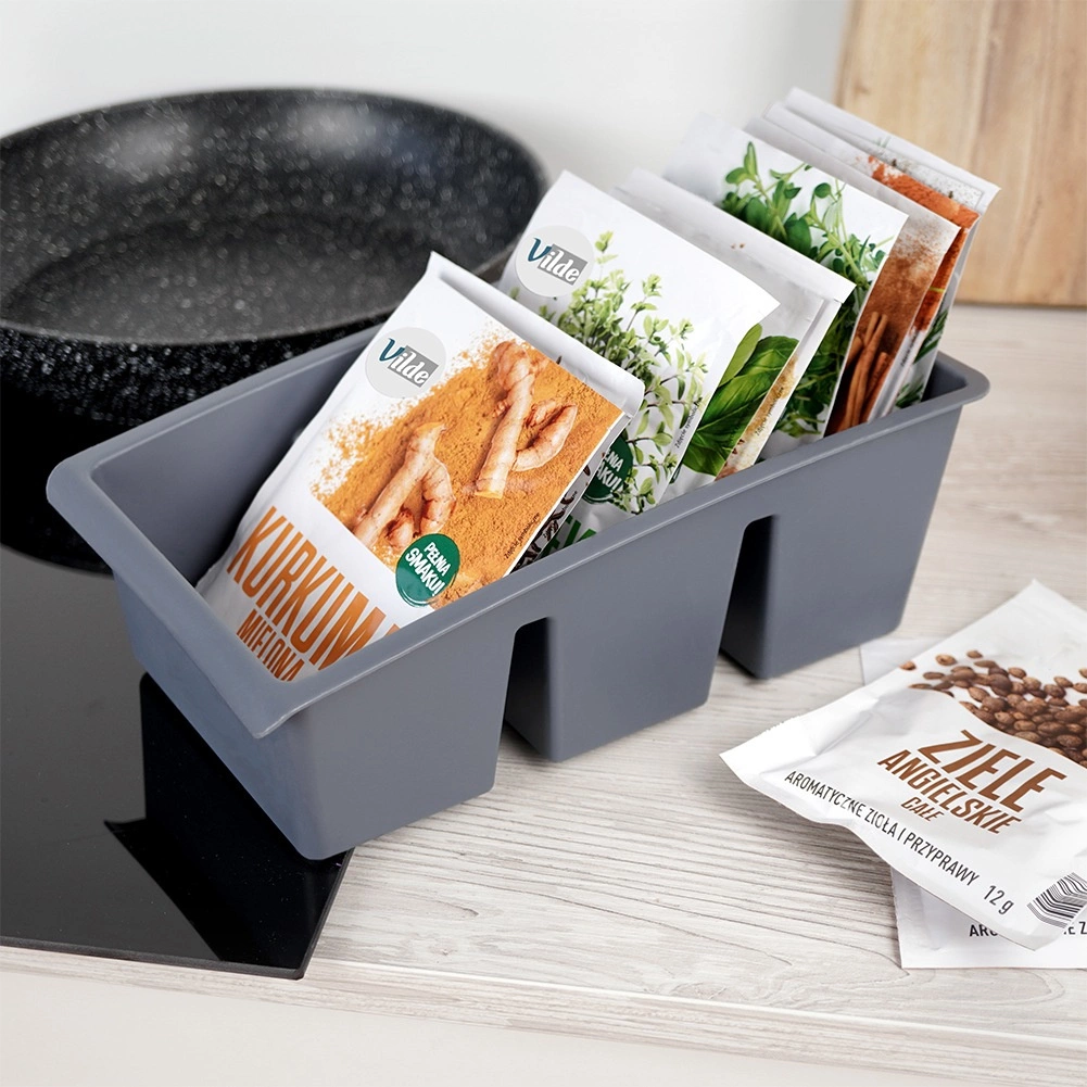 Acest organizator practic pentru bucătărie păstrează plicurile cu condimente și ierburi bine ordonate, așezate vertical și mereu la îndemână. Datorită celor două despărțitoare interne, este împărțit în trei secțiuni, astfel încât puteți sorta condimentele ușor după tip sau utilizare. Marginea frontală joasă asigură vizibilitate bună și extragerea rapidă a plicului potrivit.