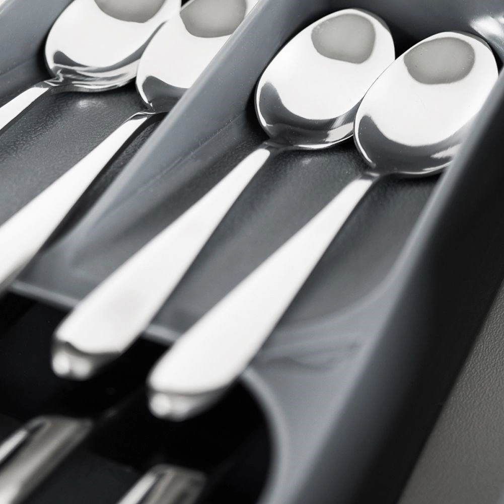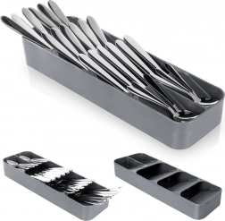 Construcția durabilă din plastic de calitate, în gri elegant, asigură o curățare ușoară și o durată de viață îndelungată. Organizatorul este ideal pentru depozitarea lingurilor, furculițelor, cuțitelor și a lingurițelor și furculițelor mici, astfel încât fiecare piesă își are locul ei.