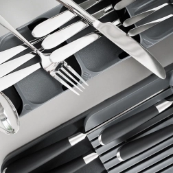 Aranjarea inteligentă, în trepte, menține lingurile, furculițele și cuțitele separate, ușor accesibile și economisește spațiu în sertar.