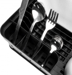 Compartimentarea bine gândită oferă loc pentru farfurii, căni și tacâmuri. Cele trei secțiuni separate pentru tacâmuri accelerează uscarea și organizarea, șanțurile pentru farfurii mențin vasele stabil în poziție verticală, iar tava de scurgere se scoate și se curăță ușor. Suportul este ideal pentru utilizarea zilnică și, datorită dimensiunilor compacte, încape chiar și pe blaturi de bucătărie mai mici.