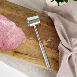 Ciocan de bucătărie robust pentru carne, din oțel inoxidabil, ideal pentru pregătirea fripturilor, cotletelor și șnițelelor. Partea netedă aplatizează eficient feliile, în timp ce partea cu proeminențe frăgezește și desface fibrele pentru un rezultat mai suculent. Datorită greutății echilibrate și mânerului confortabil, stă excelent în mână, iar lucrul este rapid și precis.