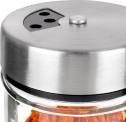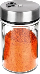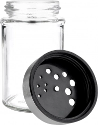 Recipient elegant din sticlă clară cu capac din oțel inoxidabil și dozator din plastic, ideal pentru utilizarea zilnică în bucătărie. Datorită celor două dimensiuni ale orificiilor, ajustați ușor presărarea fină sau mai grunjoasă și dozați întotdeauna exact cât aveți nevoie. Mecanismul închis păstrează condimentele aromate și proaspete mai mult timp.