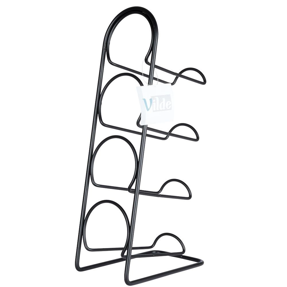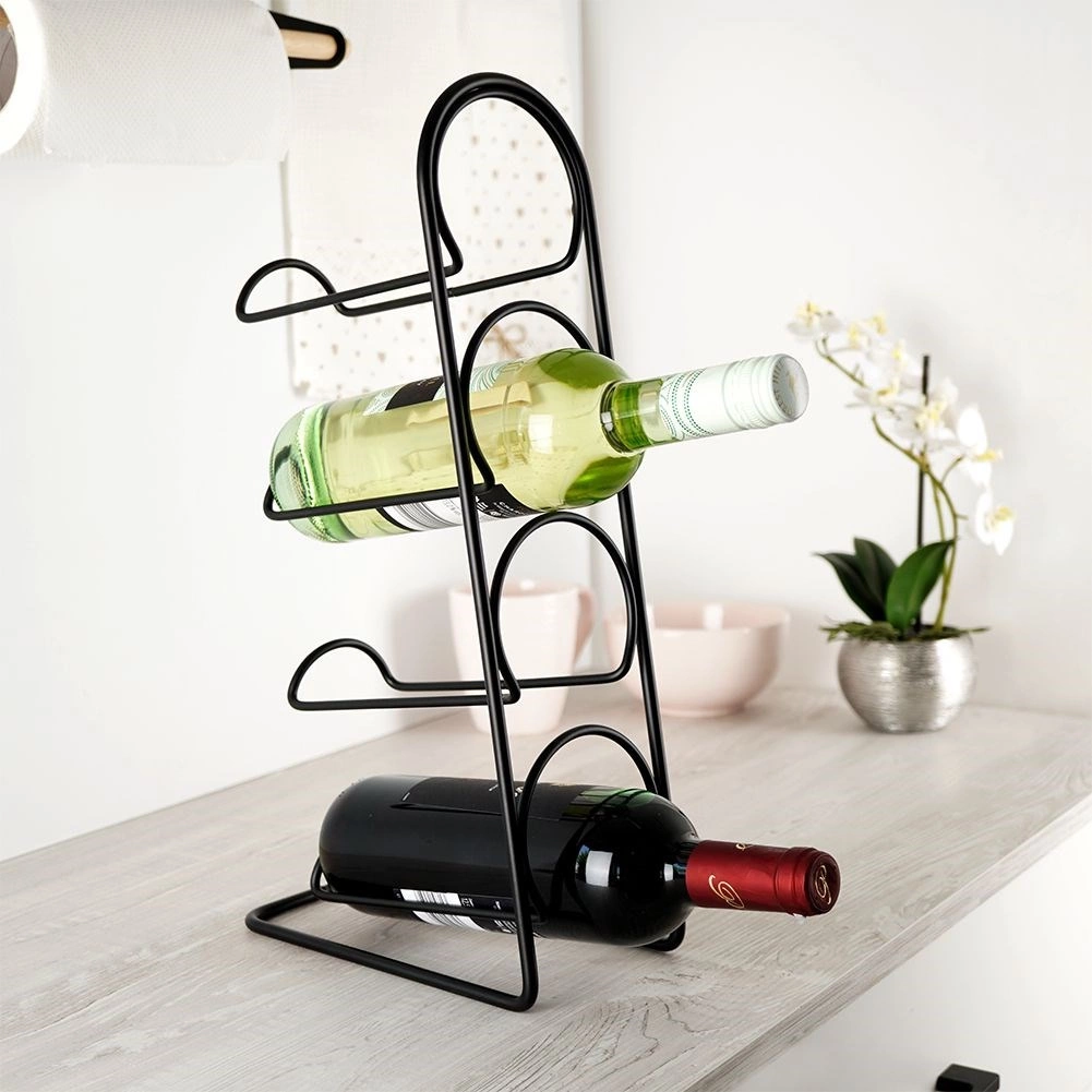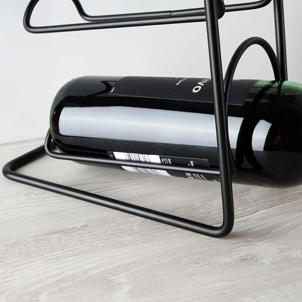 Suport practic și atrăgător pentru vin, cu design minimalist din sârmă, găzduiește până la patru sticle de vin sau alte băuturi. Construcția metalică solidă, în negru mat, este durabilă, stabilă și ușor de întreținut. Datorită depozitării orizontale a sticlelor, vinul stă corect, iar dopul rămâne umed.