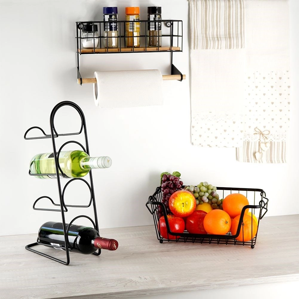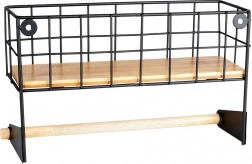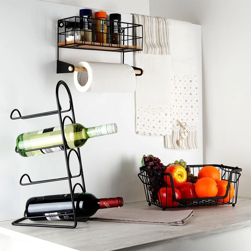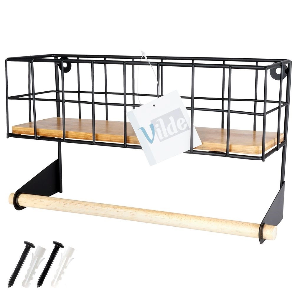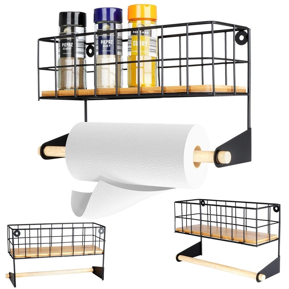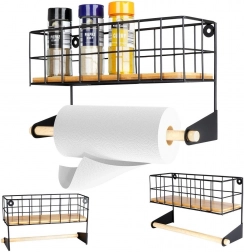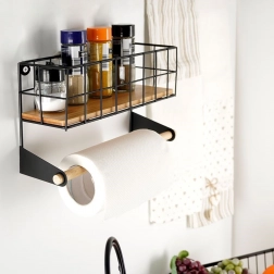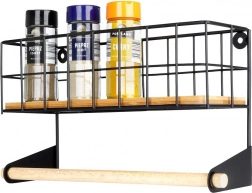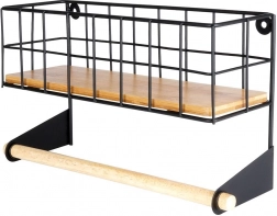 Acest raft de perete cu suport integrat pentru prosoape de hârtie te ajută să organizezi inteligent bucătăria. Coșul superior găzduiește condimente sau borcănașe mici, iar bara inferioară din lemn asigură derularea comodă a prosopului. Execuția durabilă din metal negru vopsit electrostatic și accesoriile din bambus conferă spațiului un aspect industrial modern.