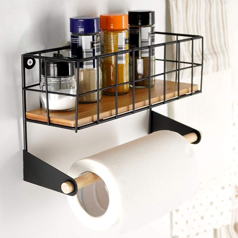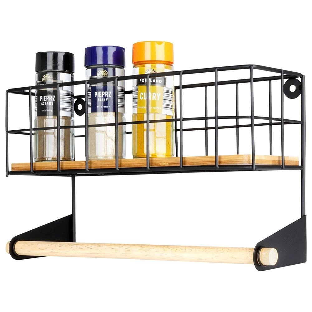 Coșul superior pentru condimente și bara inferioară din lemn pentru prosoape de hârtie economisesc spațiu și păstrează totul la îndemână.