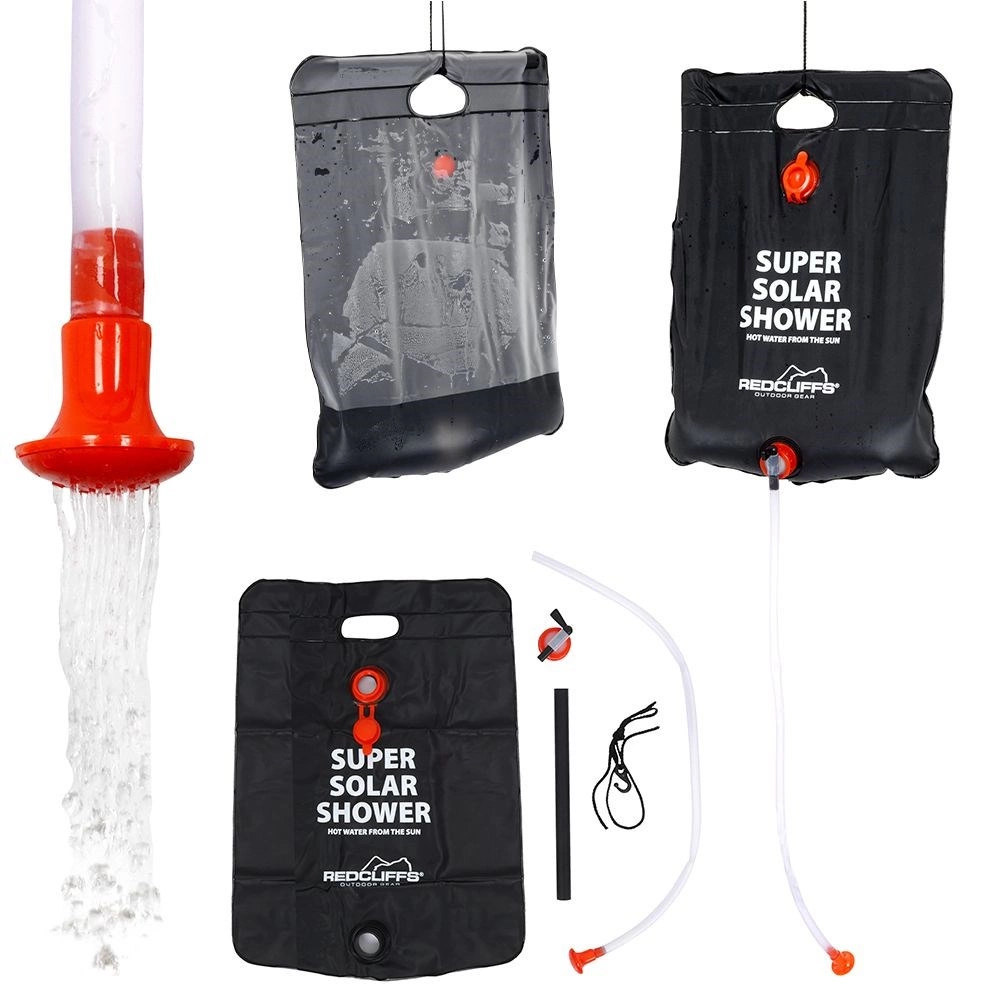 Plasticul PV durabil garantează o durată lungă de viață și siguranță la utilizare frecventă în aer liber. Umpleți cu apă, lăsați la soare, iar după câteva ore veți avea duș cald până la aproximativ 50 °C. Agățătoarea integrată, ventilul și furtunul de duș fac mai plăcută igiena zilnică în călătorii.